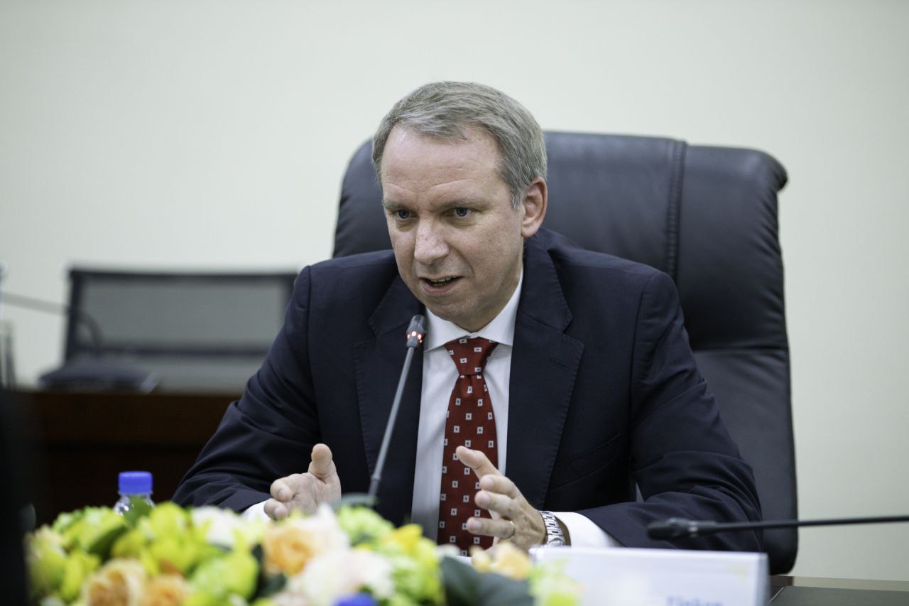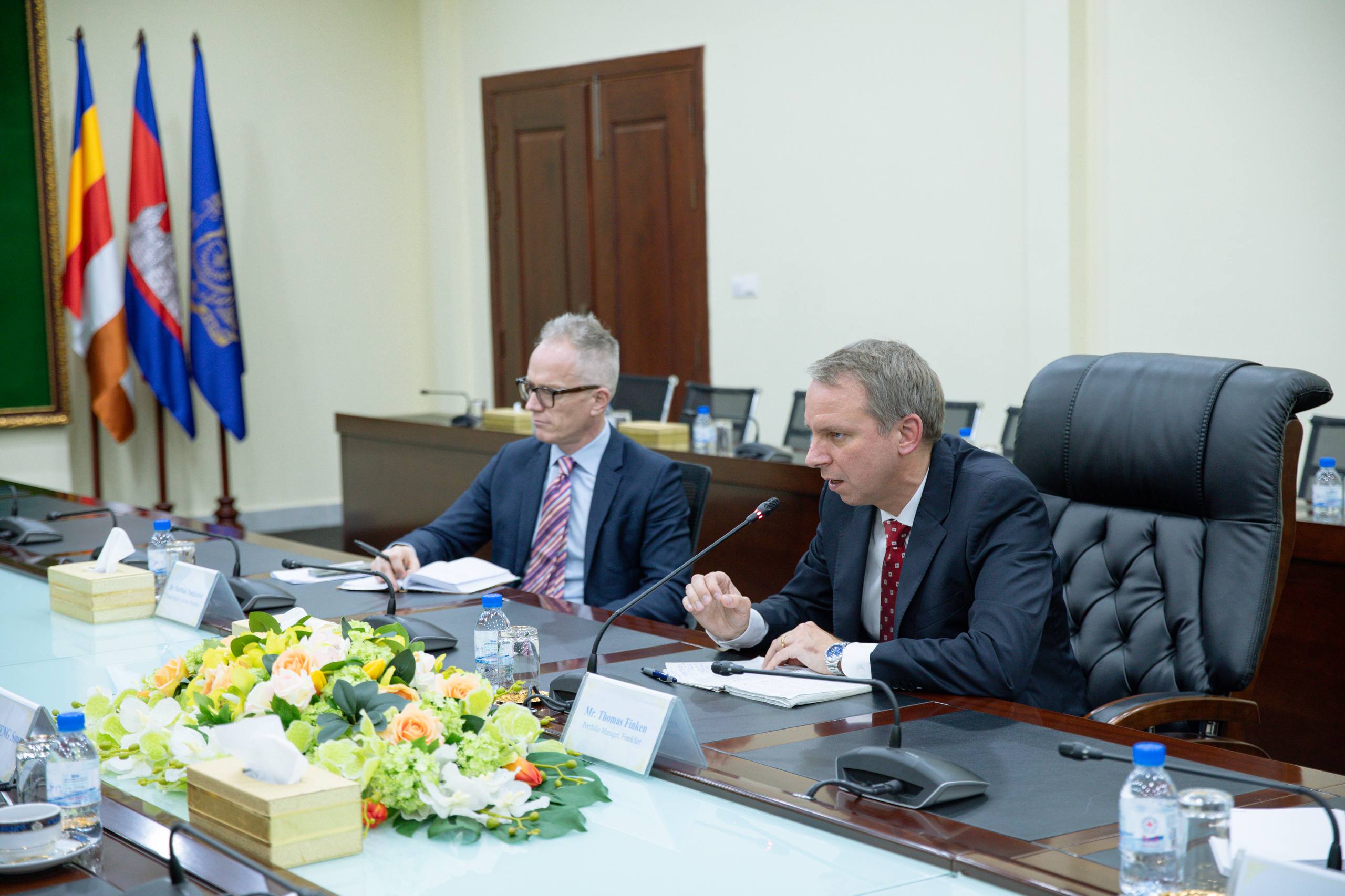 នាឱកាសនោះ ឯកឧត្ដមរដ្ឋមន្ត្រី បានសម្តែងនូវការស្វាគមន៍យ៉ាងកក់ក្តៅចំពោះ លោក Thomas Finken និងបានបញ្ជាក់ជូននូវការគាំទ្រយ៉ាងពេញទំហឹងចំពោះគំនិតផ្តួចផ្តើមក្នុងការចង់បានកិច្ចសហប្រតិបត្តិការរវាងធនាគារអភិវឌ្ឍន៍អាល្លឺម៉ង់ (KFW) ជាមួយក្រសួងការងារ និងបណ្ដុះបណ្ដាលវិជ្ជាជីវៈ ជាពិសេសពាក់ព័ន្ធនឹងវិស័យសន្តិសុខសង្គម។ បន្ថែមពីនេះ ឯកឧត្ដមរដ្ឋមន្រ្តី ក៏បានលើកឡើងនូវកាលានុវត្តភាពនៃកិច្ចសហការជាមួយធនាគារអភិវឌ្ឍន៍អាល្លឺម៉ង់ (KFW) លើវិស័យបណ្ដុះបណ្ដាលវិជ្ជាជីវៈ ក្នុងគោលបំណងអភិវឌ្ឍធនធានមនុស្សនៅប្រទេសកម្ពុជា។