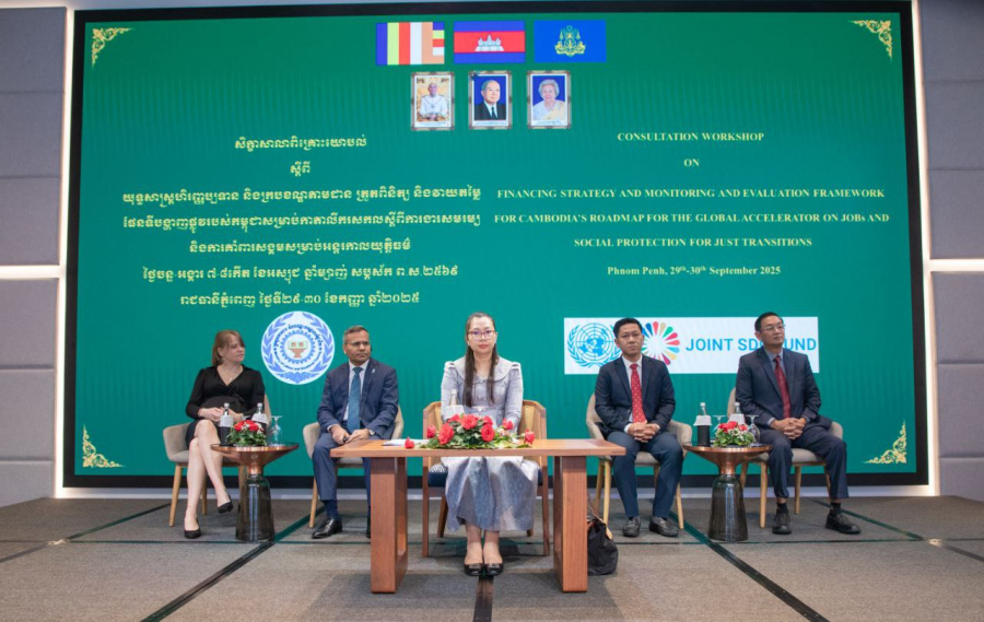 (ភ្នំពេញ)៖  លោកជំទាវ សុវណ្ណ វណ្ណារតន៍ រដ្ឋលេខាធិការប្រចាំការ តំណាងដ៏ខ្ពង់ខ្ពស់ ឯកឧត្តម ហេង សួរ រដ្ឋមន្រ្តីក្រសួងការងារ និងបណ្ដុះបណ្ដាលវិជ្ជាជីវៈ បានអញ្ជើញជាអធិបតីភាពក្នុងពិធីបើក "សិក្ខាសាលាពិគ្រោះយោបល់ស្តីពី យុទ្ធសាស្រ្ដហិរញ្ញប្បទាន និងក្របខណ្ឌតាមដាន ត្រួតពិនិត្យ និងវាយតម្លៃផែនទីបង្ហាញផ្លូវរបស់កម្ពុជាសម្រាប់កាតាលីករសកលស្តីពី ការងារសមរម្យនិងការគាំពារសង្គមសម្រាប់អន្តរកាលយុត្តិធម៌" ក្រោមការសហការរៀបចំដោយក្រសួងការងារ និងបណ្តុះបណ្តាលវិជ្ជាជីវ: កម្មវិធីអភិវឌ្ឍន៍សហប្រជាតិ (UNDP) និងអង្គការអន្តរជាតិខាងការងារ (ILO) នាព្រឹកថ្ងៃទី២៩ ខែកញ្ញា ឆ្នាំ២០២៥ នៅសណ្ឋាគារ Novotel Phnom Penh ព្រមទាំងមានការចូលរួមពីតំណាងក្រសួង-ស្ថាប័ន ដែលជាសមាជិកក្រុមការងារអន្តរក្រសួងទទួលបន្ទុកជំរុញការអនុវត្តផែនទីបង្ហាញផ្លូវរបស់បកម្ពុជាសម្រាប់កាតាលីករសកលស្តីពីការងារសមរម្យនិងការគាំពារសង្គមសម្រាប់អន្តរកាលយុត្តិធម៌ និងតំណាងដៃគូអភិវឌ្ឍន៍ពាក់ព័ន្ធសរុប ៦០រូប។