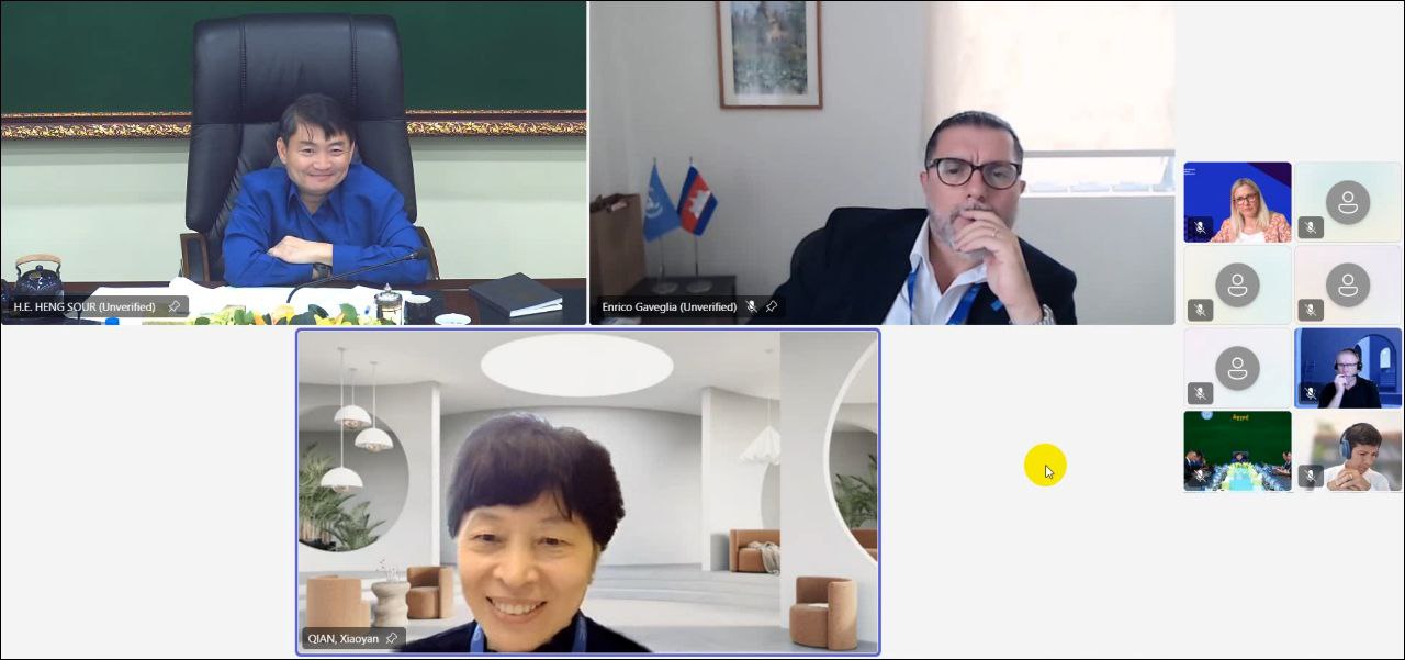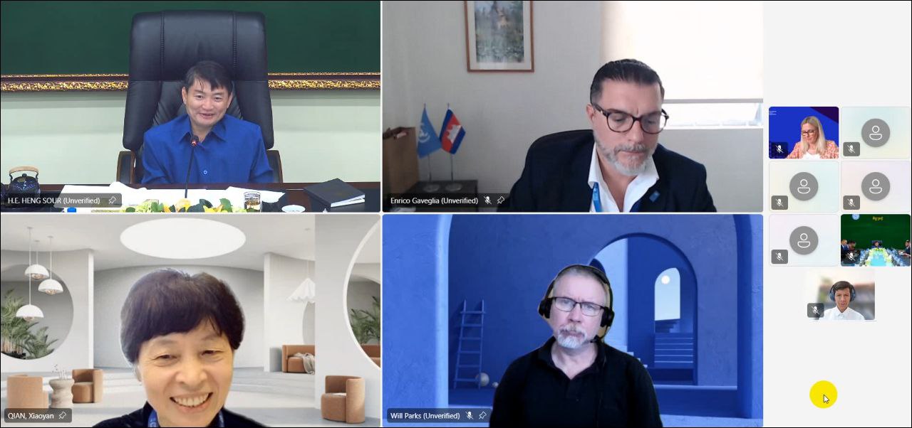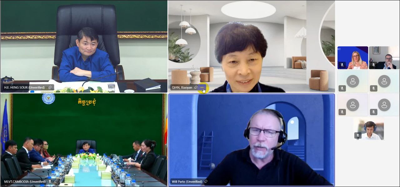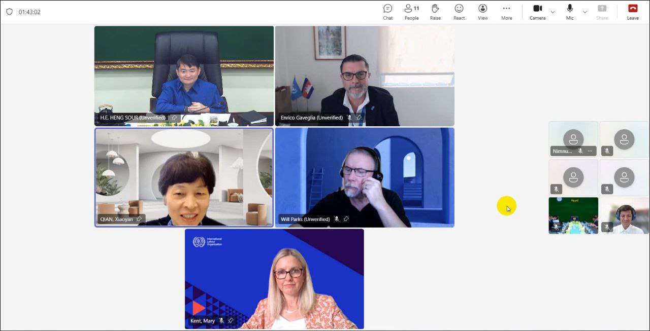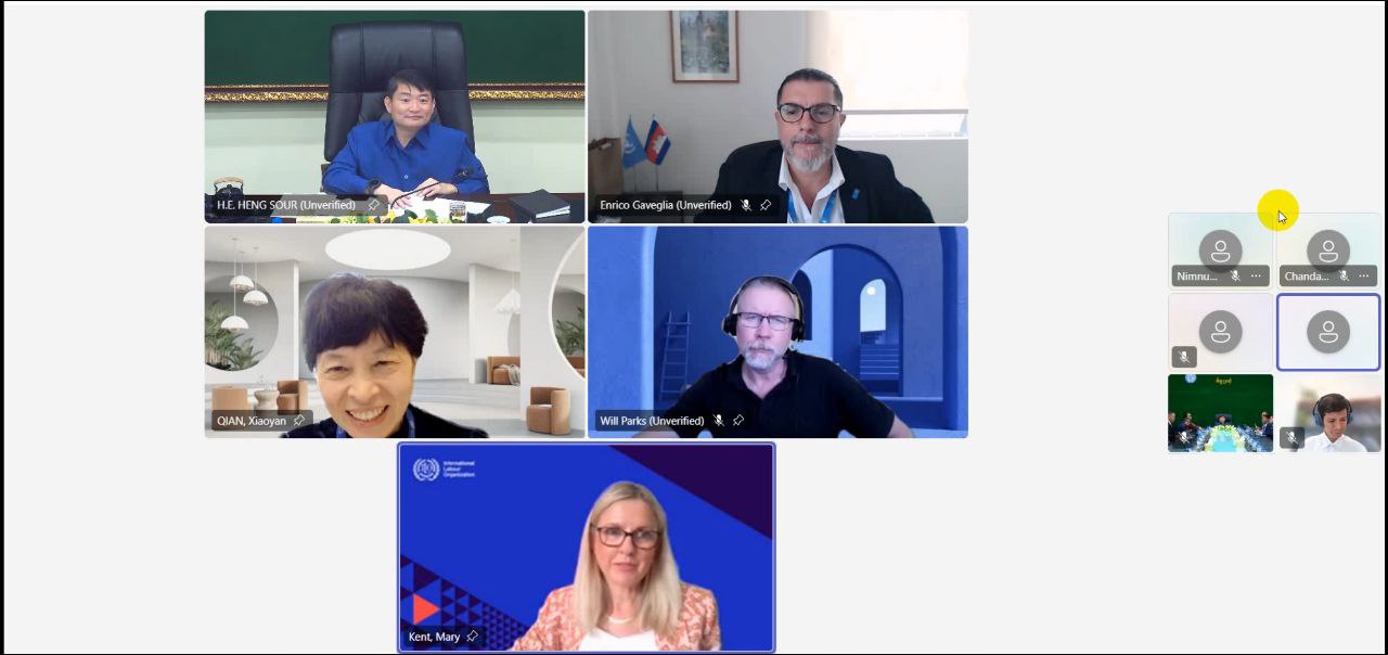 (ភ្នំពេញ)៖ ឯកឧត្តម ហេង សួរ រដ្ឋមន្ត្រីក្រសួងការងារ និងបណ្តុះបណ្តាលវិជ្ជាជីវៈបានទទួលជួបពិភាក្សាការងារជាមួយ លោកស្រី Xiaoyan Qian នាយិកាការិយាល័យអង្គការអន្តរជាតិខាងការងារ (ILO) ប្រចាំប្រទេសថៃ កម្ពុជា និងឡាវ និងតំណាងទីភ្នាក់ងារអង្គការសហប្រជាជាតិ តាមប្រព័ន្ធអនឡាញ នារសៀលថ្ងៃទី២៤ ខែវិច្ឆិកា ឆ្នាំ២០២៥ ដើម្បីពិភាក្សាស្វែងយល់អំពីវឌ្ឍនភាព និងទិសដៅសម្រាប់ការអនុវត្តផែនទីបង្ហាញផ្លូវរបស់កម្ពុជាសម្រាប់កាតាលិករសកលស្តីពីការងារសមរម្យ និងការគាំពារសង្គមសម្រាប់អន្តរកាលយុត្តិធម៌ (ក.ផ.ក.អ.)។