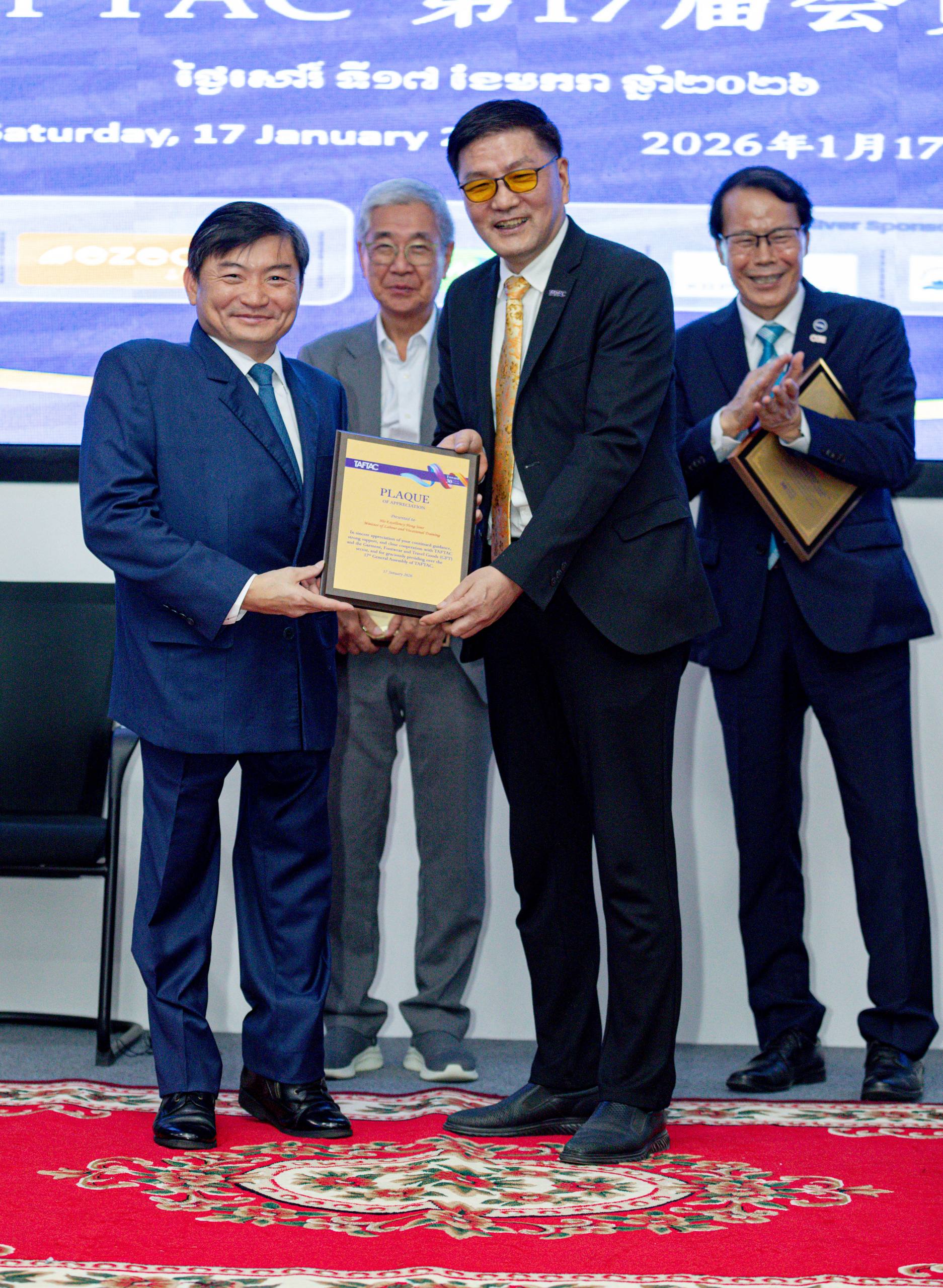 (ភ្នំពេញ)៖ ឯកឧត្តម ហេង សួរ រដ្ឋមន្ត្រីក្រសួងការងារ និងបណ្តុះបណ្តាលវិជ្ជាជីវៈ បានអបអរសាទរយ៉ាងកក់ក្តៅចំពោះលោក He Enjia ដែលត្រូវបានអង្គសន្និបាតបោះឆ្នោតជ្រើសតាំងជាប្រធានសមាគម TAFTAC សម្រាប់អាណត្តិទី១៧ (២០២៦-២០២៨)។ ឯកឧត្តមបានវាយតម្លៃខ្ពស់ចំពោះសមាគម TAFTAC ដែលបានដើរតួយ៉ាងសំខាន់ជាដៃគូដែលអាចជឿទុកចិត្តបានរបស់រាជរដ្ឋាភិបាល និយោជក និងជាដៃគូដ៏ល្អរបស់កម្មករនិយោជិត ក្នុងការចរចា និងពិភាក្សាការងារផ្សេងៗ សំដៅរក្សា និងពង្រីកវិស័យនេះ ព្រមទាំងរួមចំណែកជំរុញលើកកម្ពស់លក្ខខណ្ឌការងារ សុខុមាលភាព និងសិទ្ធិការងារនៅកម្ពុជា។