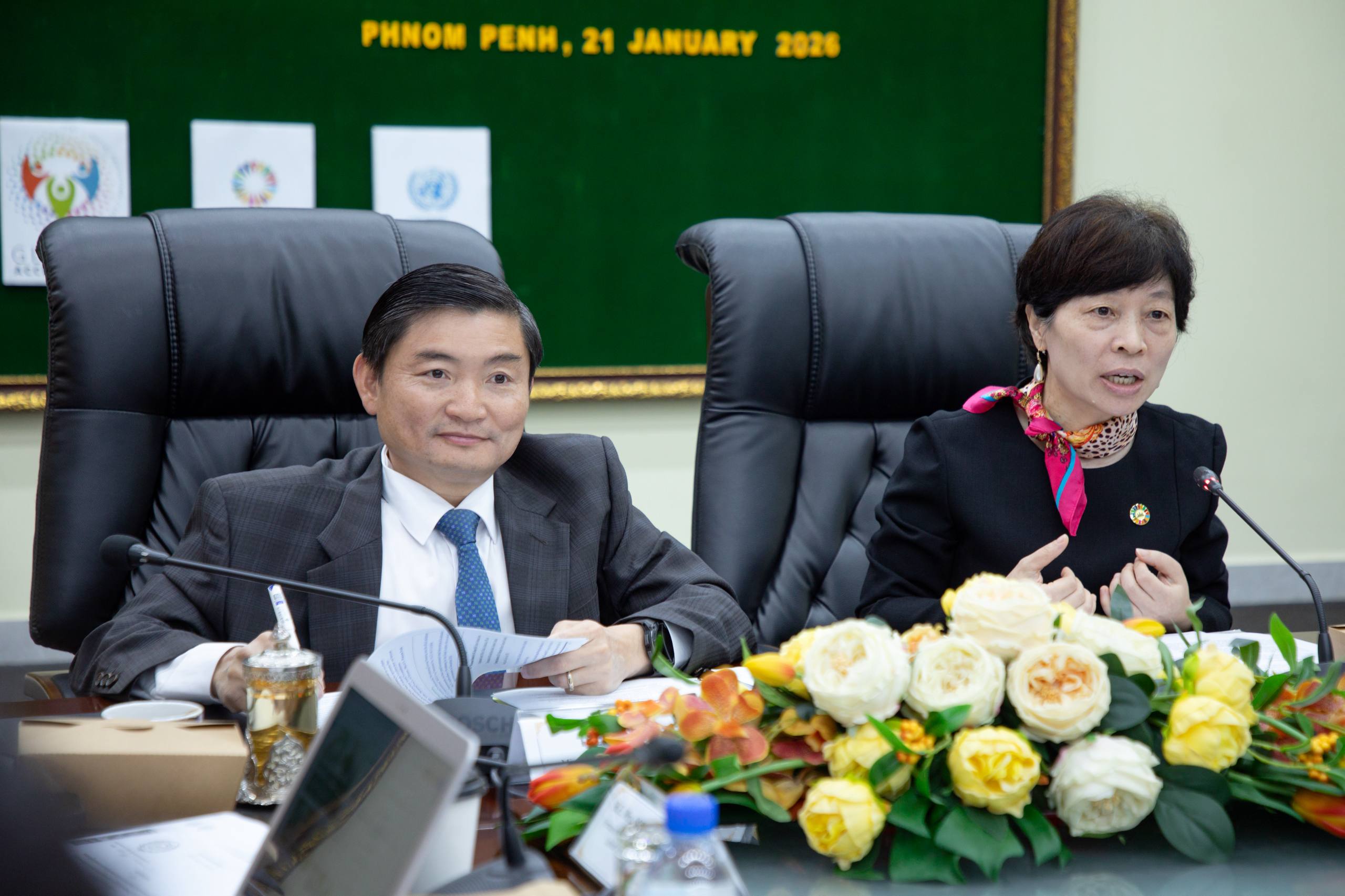 (ភ្នំពេញ)៖ ឯកឧត្តម ហេង សួរ រដ្ឋមន្ត្រីក្រសួងការងារ និងបណ្តុះបណ្តាលវិជ្ជាជីវៈ និងលោកស្រី Xiaoyan Qian នាយិកាអង្គការអន្តរជាតិខាងការងារ (ILO) ប្រចាំប្រទេសកម្ពុជា ឡាវ និងថៃ ដែលជាសហប្រធានក្រុមការងារបច្ចេកទេសចម្រុះ (JTWG) នៃគម្រោងកាតាលីករសកលកម្ពុជា បានធ្វើជាសហអធិបតីក្នុងកិច្ចប្រជុំ ដើម្បីជំរុញការអនុវត្តផែនទីបង្ហាញផ្លូវកម្ពុជា ស្តីពី «កាតាលីករសកលស្តីពីការងារសមរម្យ និងការគាំពារសង្គមសម្រាប់អន្តរកាលយុត្តិធម៌» រៀបចំធ្វើឡើង នាព្រឹកថ្ងៃពុធ ទី២១ ខែមករា ឆ្នាំ២០២៦ នាទីស្តីការក្រសួង។