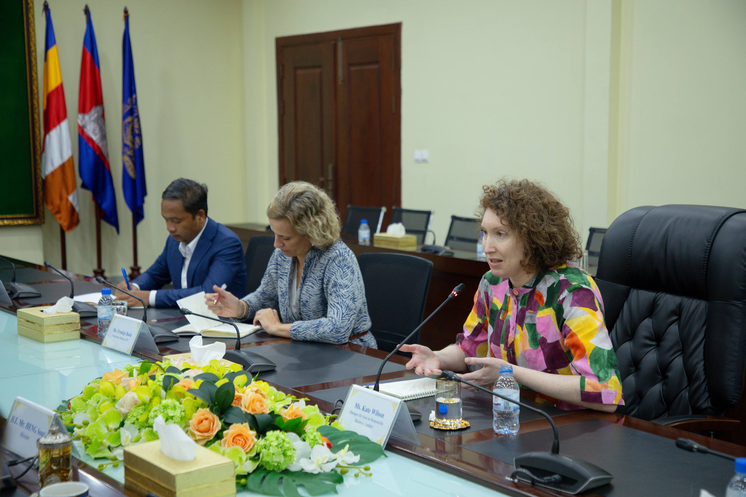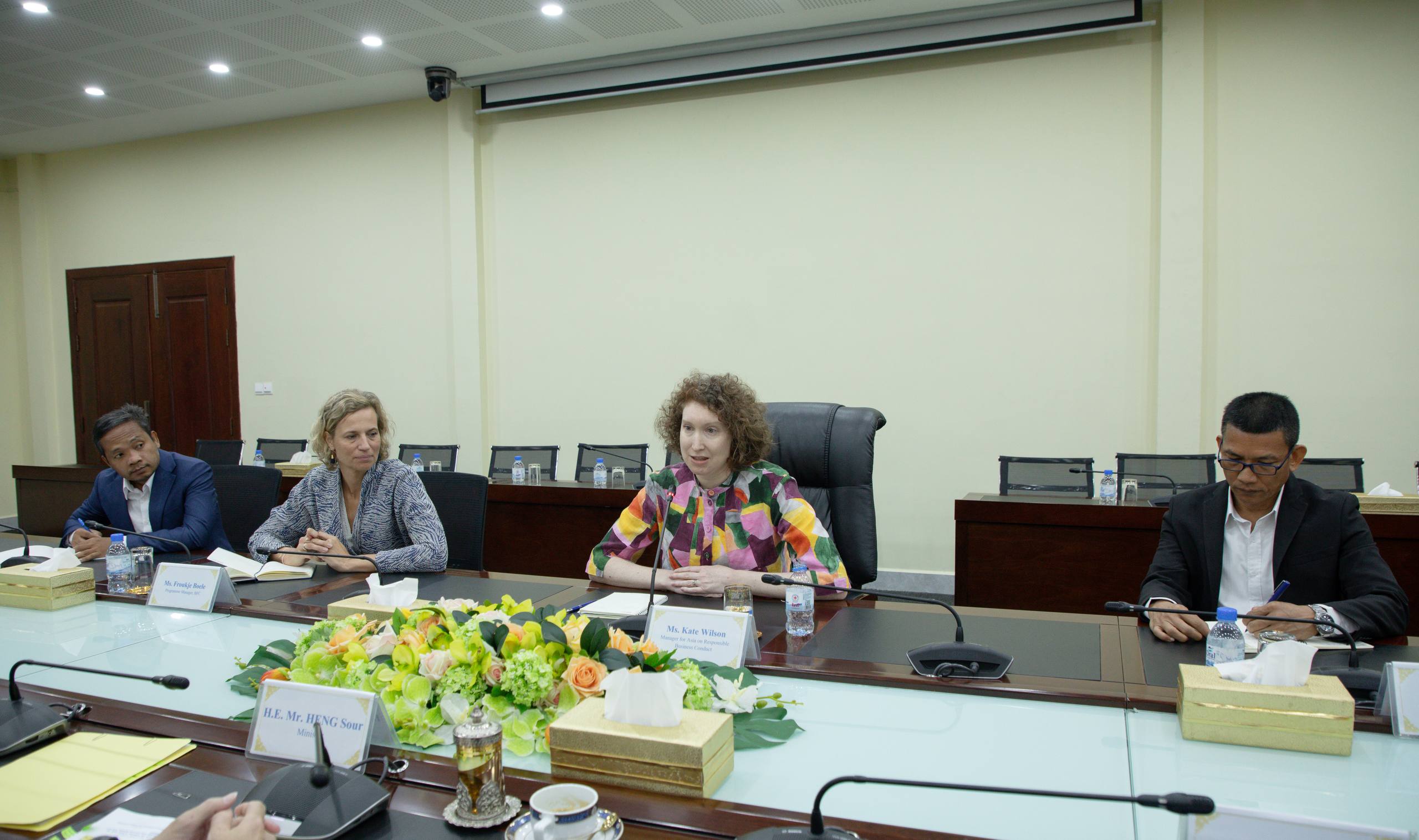 (ភ្នំពេញ)៖ ឯកឧត្តម ហេង សួរ រដ្ឋមន្ត្រីក្រសួងការងារ និងបណ្ដុះបណ្ដាលវិជ្ជាជីវៈ បានទទួលជួបសម្ដែងការគួរសម និងពិភាក្សាការងារជាមួយលោកស្រី Kate Wilson ប្រធានកម្មវិធីប្រចាំតំបន់អាស៊ី នៃមជ្ឈមណ្ឌលសម្រាប់អាជីវកម្មប្រកបដោយការទទួលខុសត្រូវរបស់អង្គការសម្រាប់កិច្ចសហប្រតិបត្តិការ និងអភិវឌ្ឍន៍សេដ្ឋកិច្ច (OECD) នាព្រឹកថ្ងៃទី២ ខែមីនា ឆ្នាំ២០២៦ នៅទីស្តីការក្រសួង ដើម្បីស្វែងរកឱកាសពង្រឹងកិច្ចសហប្រតិបត្តិការ និងពិភាក្សាលើយុទ្ធសាស្ត្រនៃការអនុវត្តអាជីវកម្មប្រកបដោយការទទួលខុសត្រូវ (RBC) ដែលស្របតាមអាទិភាពគោលនយោបាយបច្ចុប្បន្នរបស់ក្រសួងការងារ និងបណ្តុះបណ្តាលវិជ្ជាជីវៈ។