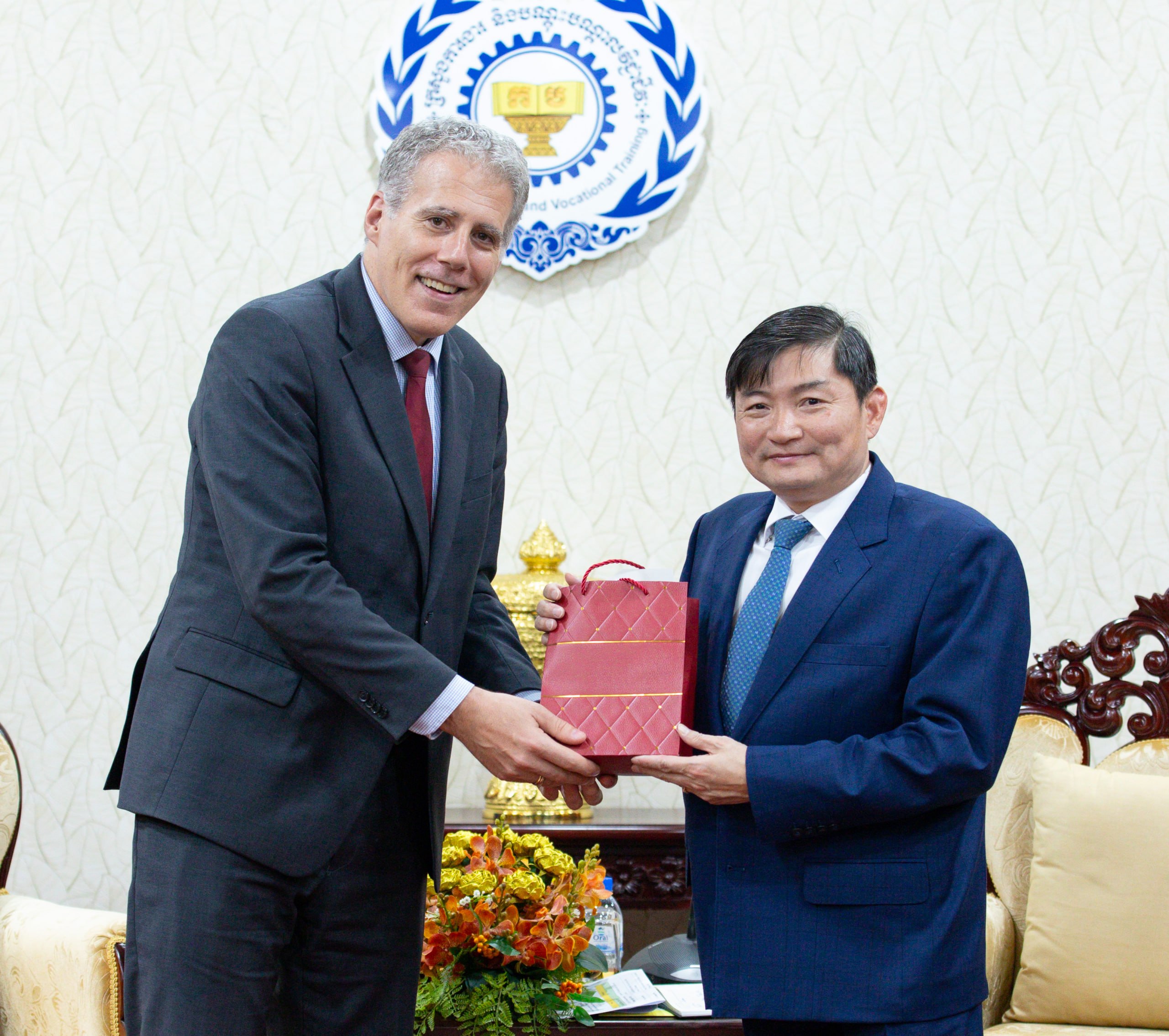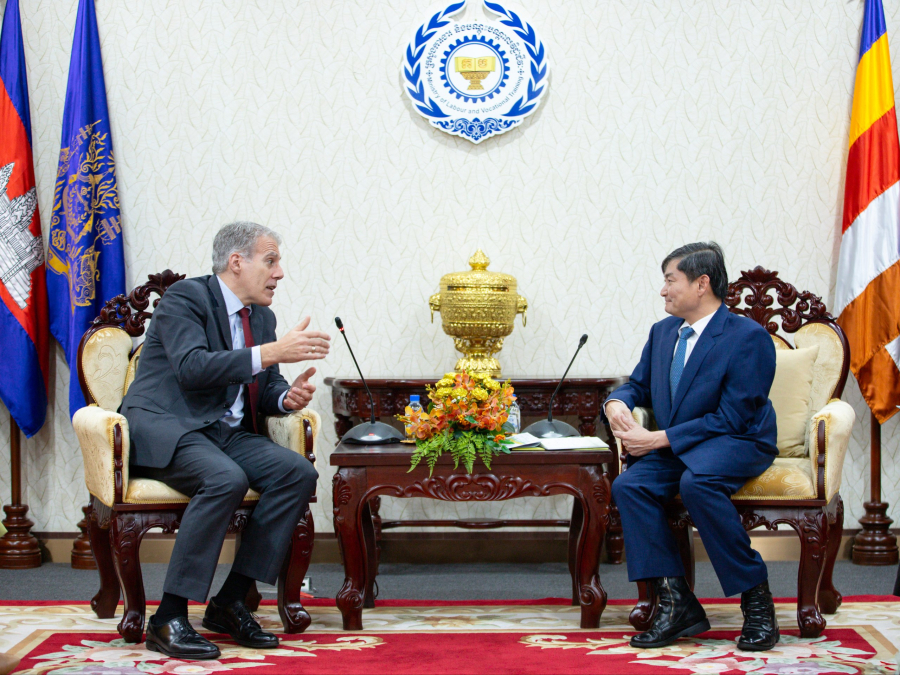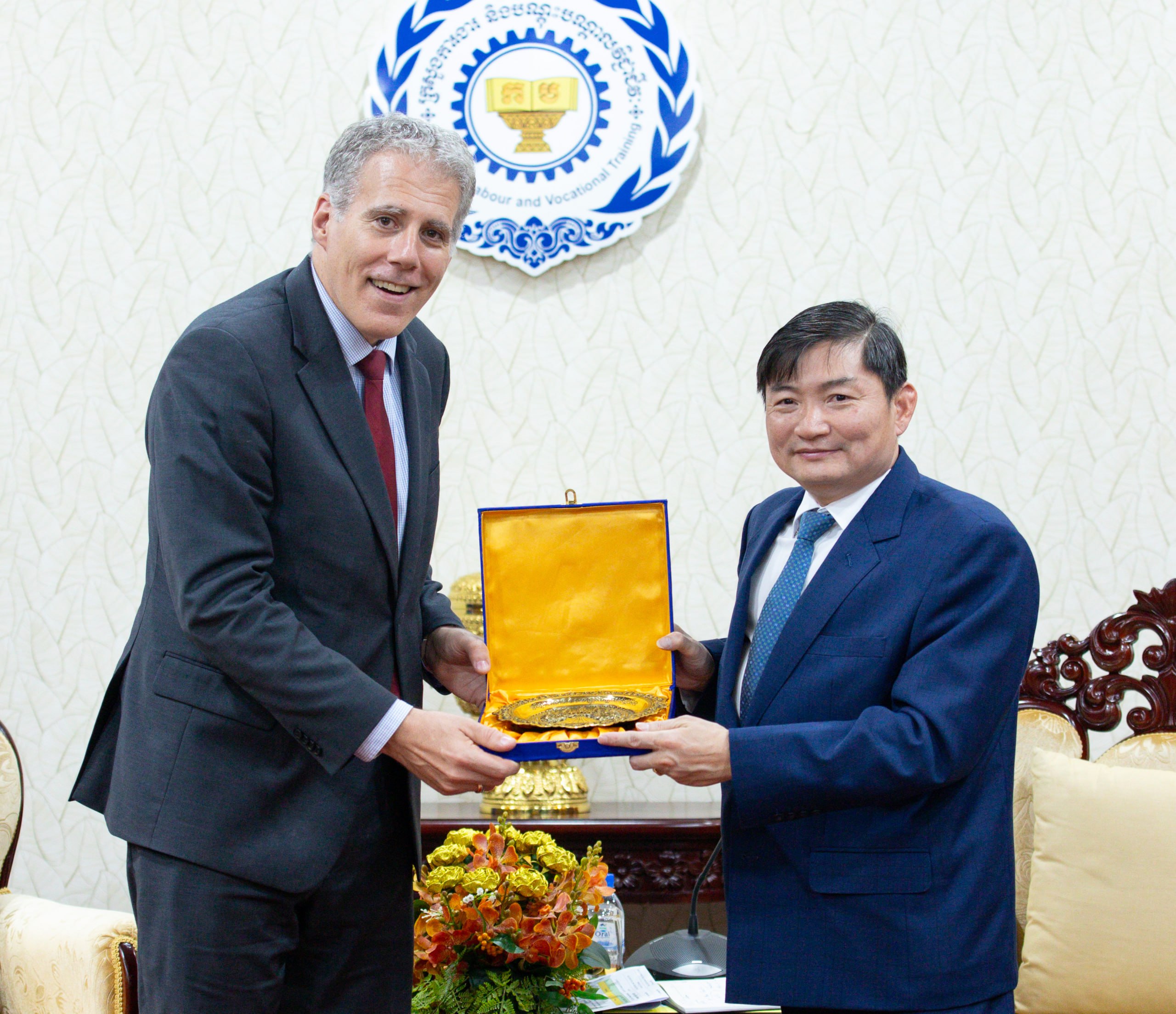 (រាជធានីភ្នំពេញ)៖ នារសៀលថ្ងៃពុធ ទី១៨ ខែមីនា ឆ្នាំ២០២៦ ឯកឧត្តម ហេង សួរ រដ្ឋមន្ត្រីក្រសួងការងារ និងបណ្តុះបណ្តាលវិជ្ជាជីវៈ បានអនុញ្ញាតឱ្យឯកឧត្តម គ្រីស្ទៀន ដេរ៉ូហ្ស (Christian DesRoches) ឯកអគ្គរដ្ឋទូតវិសាមញ្ញ និងពេញសមត្ថភាពនៃប្រទេសកាណាដាប្រចាំកម្ពុជា ចូលជួបសម្ដែងការគួរសម និងពិភាក្សាការងារ នៅទីស្តីការក្រសួង ដើម្បីពង្រឹងកិច្ចសហប្រតិបត្តិការទ្វេភាគីលើវិស័យការងារ សន្តិសុខសង្គម និងការបណ្តុះបណ្តាលវិជ្ជាជីវៈ។