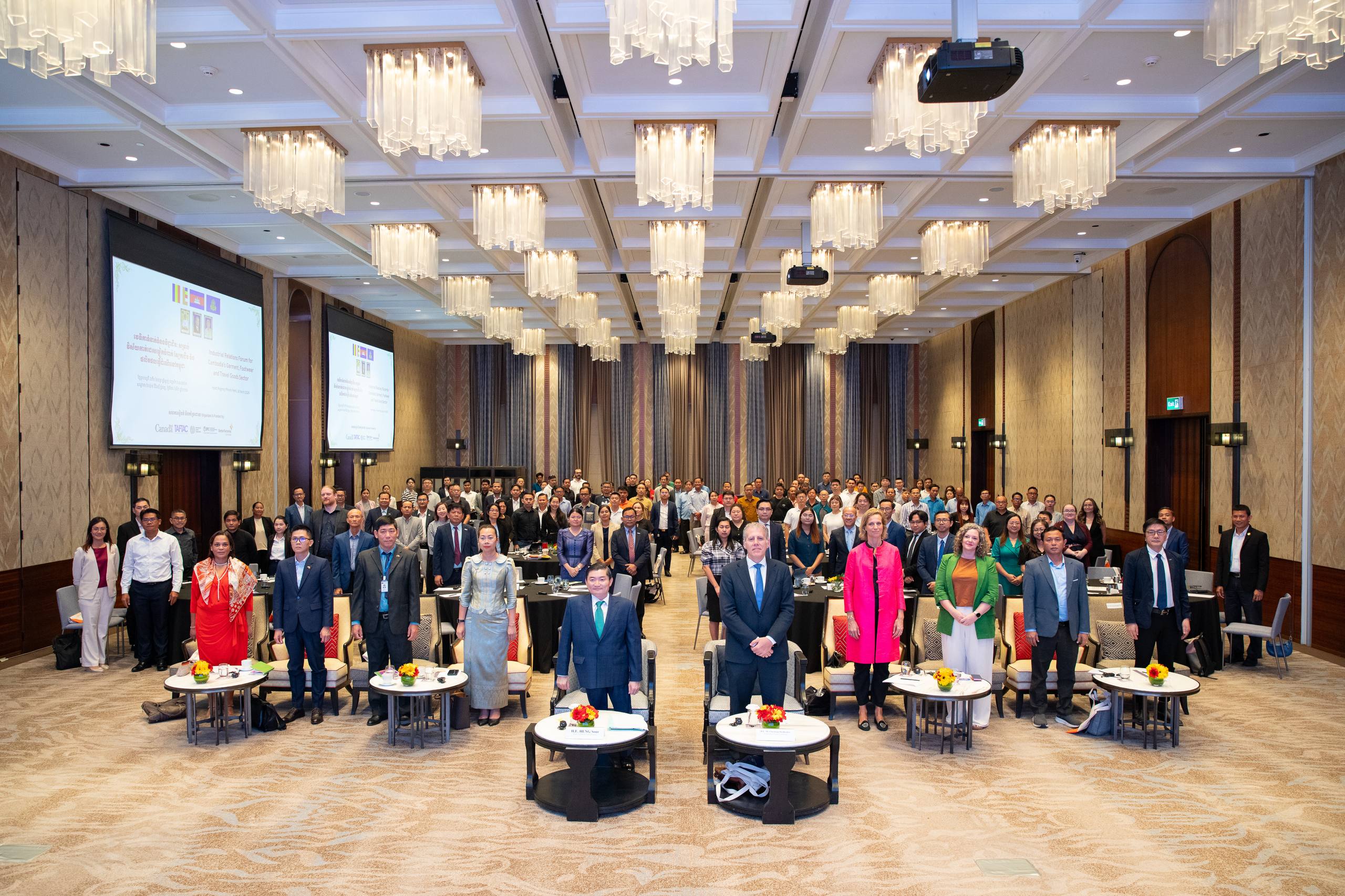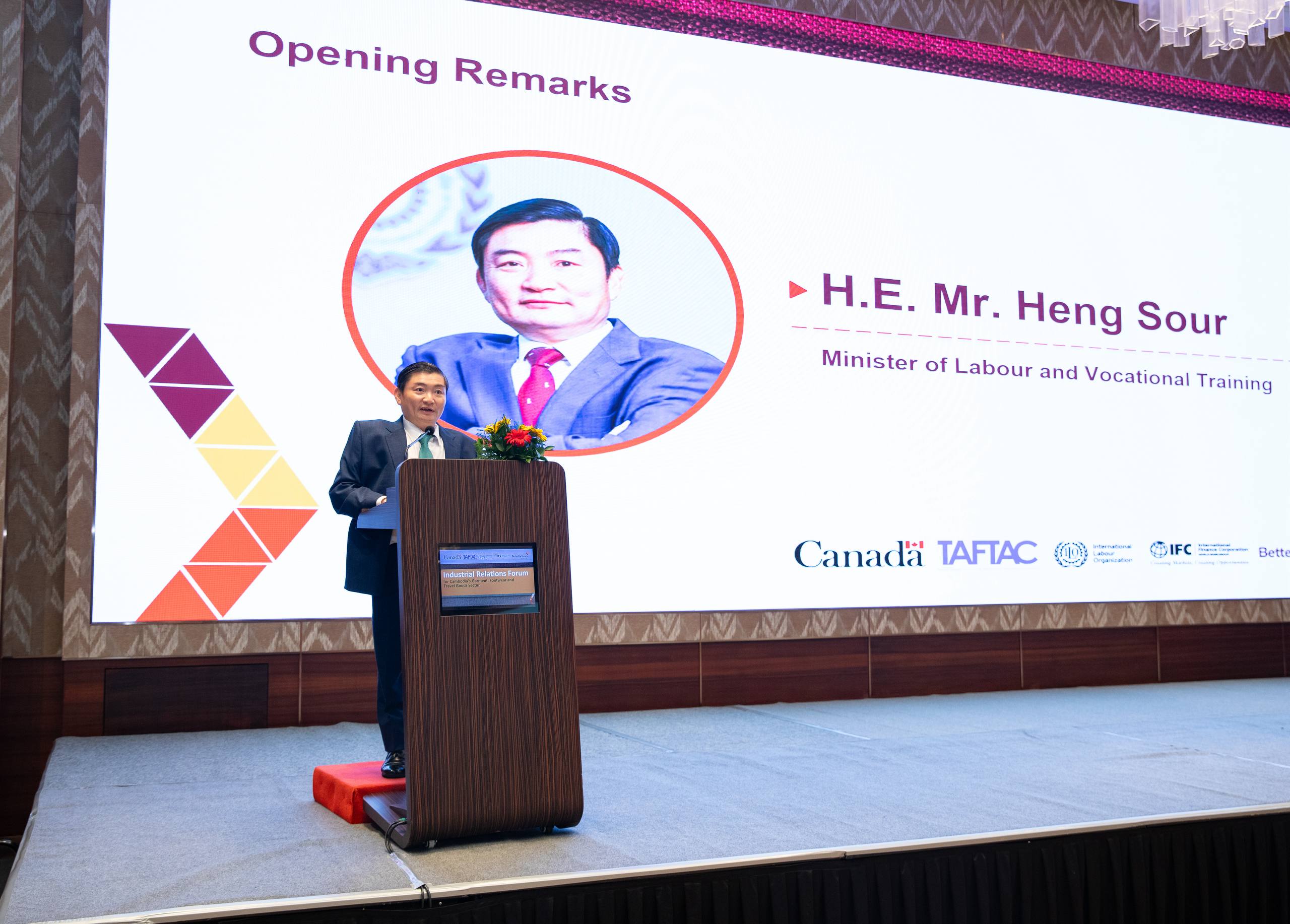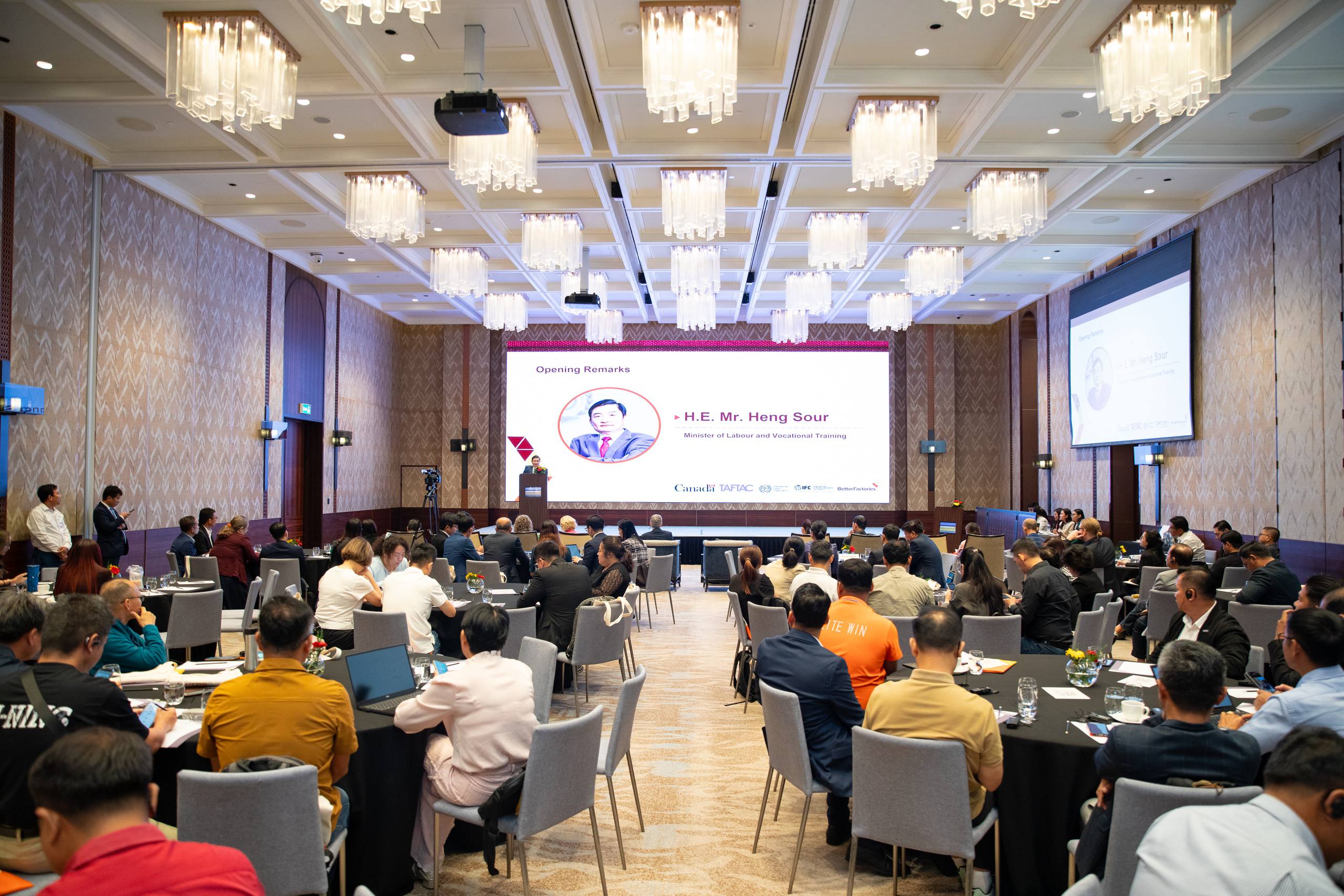 ក្នុងវេទិកាដែលធ្វើឡើងនៅសណ្ឋាគារ Hyatt Regency ភ្នំពេញ ឯកឧត្ដមរដ្ឋមន្រ្តី បានថ្លែងនូវអំណរគុណចំពោះឯកឧត្ដម Christian DesRoches ឯកអគ្គរដ្ឋទូតកាណាដាប្រចាំកម្ពុជា និងលោកស្រី Froukje Boele ប្រធានគម្រោងរោងចក្រកាន់តែប្រសើរនៅកម្ពុជា (ILO-BFC) ដែលបានសហការរៀបចំវេទិកានាពេលនេះ ជាវេលាដ៏សមស្របមួយខណៈស្ថានភាពពិភពលោកកាន់តែមិនប្រាកដប្រជា និងជះផលអវិជ្ជមានជាច្រើនលើសេដ្ឋកិច្ច ដែលតម្រូវឱ្យយើងកាន់តែរួមគ្នាជម្នះរាល់ឧបសគ្គស្វែងរកដំណោះស្រាយ ដើម្បីអាចរក្សាបាននូវបរិយាកាសវិនិយោគ និងរក្សាបាននូវការងារជូនបងប្អូនកម្មករនិយោជិត ជាពិសសក្នុងវិស័យកាត់ដេរសម្លៀកបំពាក់ ស្បែកជើង និងផលិតផលធ្វើដំណើរនៅកម្ពុជា (GFT)។