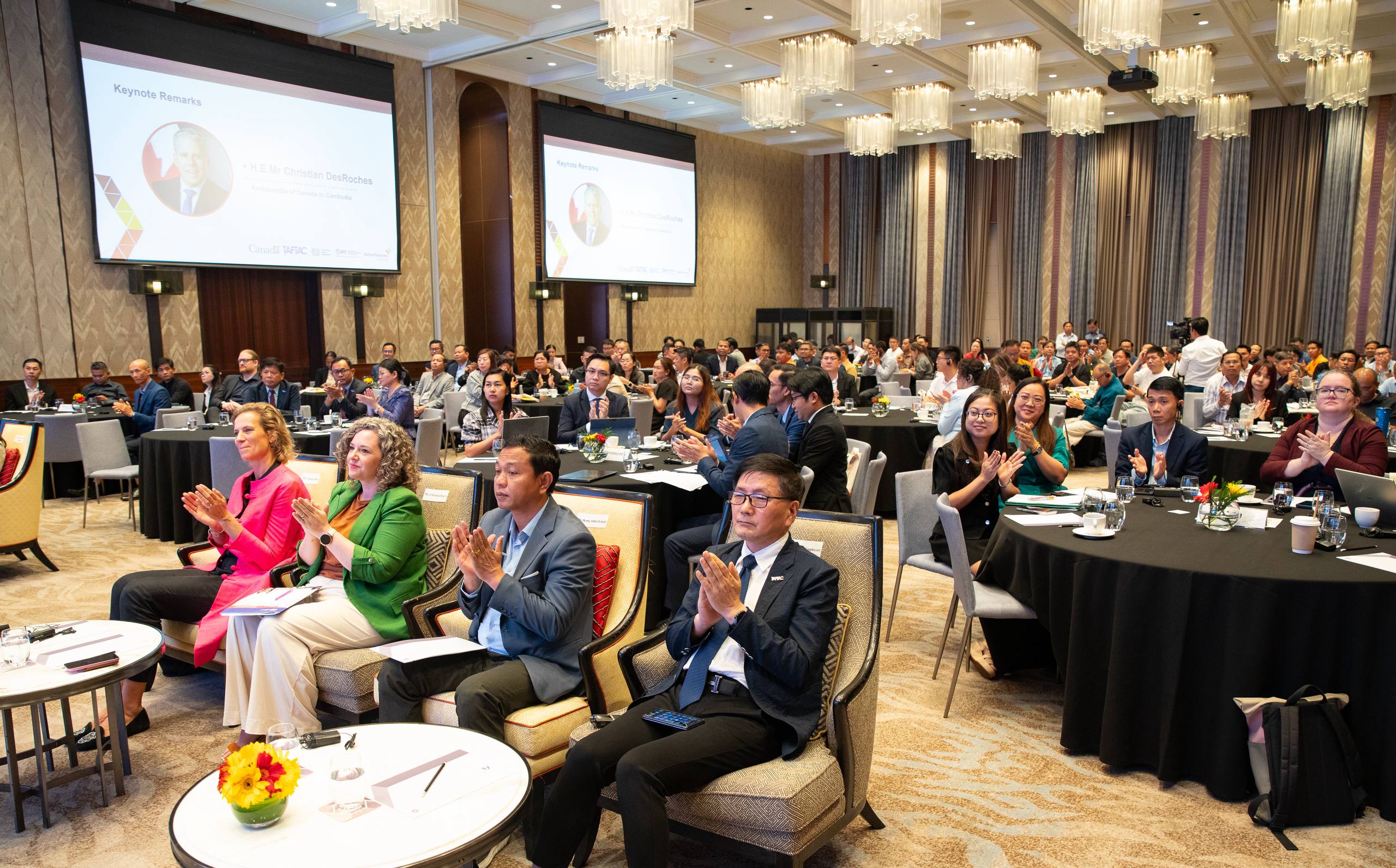 នាឱកាសនោះដែរ ឯកឧត្ដម Christian DesRoches ឯកអគ្គរដ្ឋទូតកាណាដាប្រចាំកម្ពុជា និងលោកស្រី Froukje Boele ប្រធានគម្រោង ILO-BFC បានសង្កត់ធ្ងន់ពីសារៈសំខាន់នៃទំនាក់ទំនងវិជ្ជាជីវៈ ដែលកើតចេញពីការប្តេជ្ញាចិត្តរួមរបស់រដ្ឋាភិបាល និយោជក និងសហជីព ក្នុងការពង្រឹងវិស័យផលិតកម្ម និងលើកកម្ពស់សិទ្ធិកម្មករនិយោជិត តាមរយៈសន្ទនាសង្គម និងកិច្ចសហប្រតិបត្តិការ។ ពួកគាត់ប្តេជ្ញាគាំទ្រក្នុងការអភិវឌ្ឍប្រព័ន្ធទំនាក់ទំនងវិជ្ជាជីវៈដ៏រឹងមាំ ដែលជួយបង្កើនផលិតភាព និងស្ថិរភាពការងារ ព្រោះថាការចូលរួមរបស់ភាគីទាំងអស់ និងការប្រើប្រាស់បច្ចេកវិទ្យាថ្មី នឹងជួយបន្តលើកកម្ពស់វិស័យនេះឱ្យមានចីរភាព។