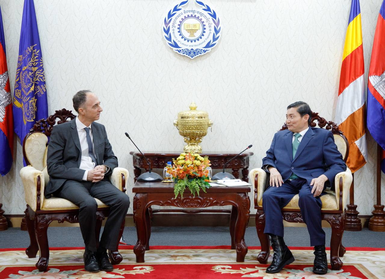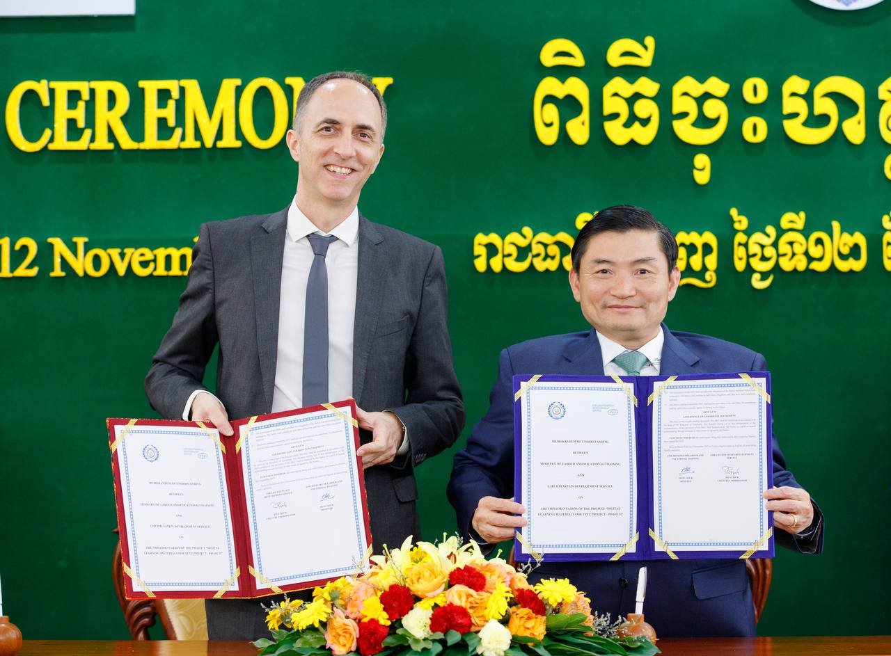 (ភ្នំពេញ)៖ ឯកឧត្តម ហេង សួរ រដ្ឋមន្ត្រីក្រសួងការងារ និងបណ្តុះបណ្តាលវិជ្ជាជីវៈ និងលោក Pius Frick អ្នកសម្របសម្រួលប្រចាំប្រទេសរបស់ភា្នក់ងារអភិវឌ្ឍន៍លិចតិនស្តាញ(Liechtenstein Development Service - LED) បានចុះអនុស្សរណៈស្តីពីការអនុវត្តគម្រោង "សម្ភារៈសិក្សាឌីជីថលសម្រាប់ អ.ប.វ.- ដំណាក់កាលទី២" នារសៀលថ្ងៃទី១២ ខែវិច្ឆិកា ឆ្នាំ២០២៥ នៅទីស្តីការក្រសួងការងារ និងបណ្តុះបណ្តាលវិជ្ជាជីវៈ។