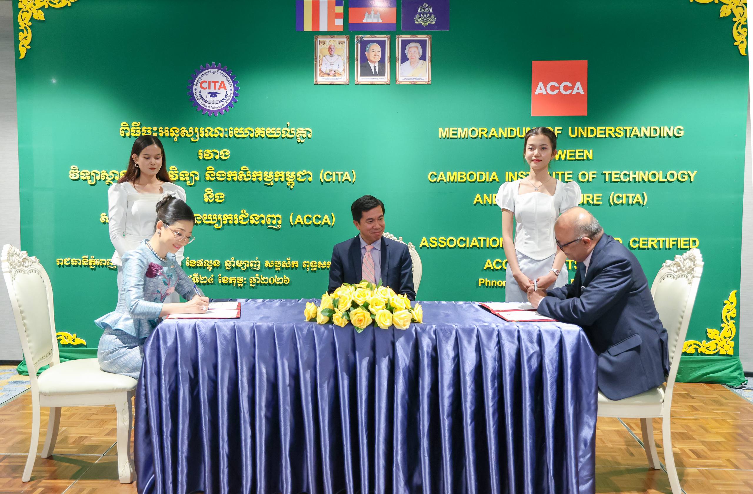 (ភ្នំពេញ)៖ នៅរសៀលថ្ងៃអង្គារ ទី២៤ ខែកុម្ភៈ ឆ្នាំ២០២៦ វិទ្យាស្ថានបច្ចេកវិទ្យា និងកសិកម្មកម្ពុជា (CITA) បានចុះអនុស្សរណៈនៃការយោគយល់គ្នា (MoU) ជាមួយសមាគមគណនេយ្យករជំនាញ (ACCA) និងវិទ្យាស្ថានគណនេយ្យធុរកិច្ច (BSA) ដែលពិធីនេះប្រព្រឹត្តទៅក្រោមអធិបតី ឯកឧត្តម ជា កុសល រដ្ឋលេខាធិការ តំណាងដ៏ខ្ពង់ខ្ពស់របស់ ឯកឧត្តម ហេង សួរ រដ្ឋមន្ត្រីក្រសួងការងារ និងបណ្តុះបណ្តាលវិជ្ជាជីវៈ នៅសណ្ឋាគារ ហៃយ៉ាត់ រេជិនស៊ី រាជធានីភ្នំពេញ។
