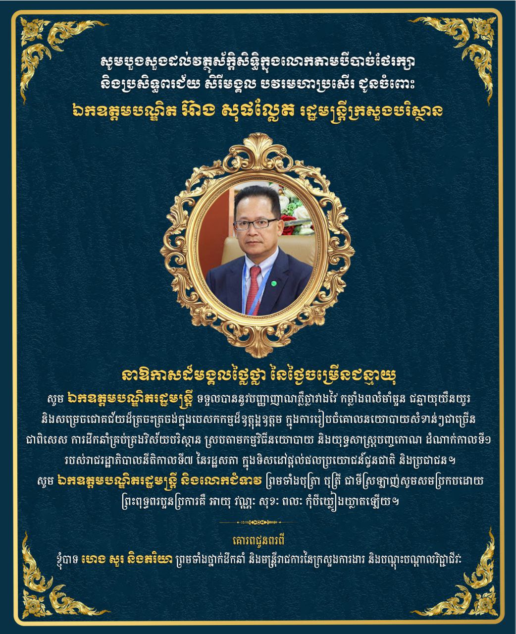 ឯកឧត្តម ហេង សួរ និងភរិយា ព្រមទាំងថ្នាក់ដឹកនាំ និងមន្ត្រីរាជការគ្រប់លំដាប់ថ្នាក់នៃក្រសួងការងារ និងបណ្តុះបណ្តាលវិជ្ជាជីវៈ សូមប្រសិទ្ធពរជ័យជូនចំពោះ ឯកឧត្តមបណ្ឌិត អ៊ាង សុផល្លែត រដ្ឋមន្ត្រីក្រសួងបរិស្ថាន ក្នុងឱកាសជ័យមង្គលនៃខួបកំណើតរបស់ ឯកឧត្តមបណ្ឌិតរដ្ឋមន្ត្រី ដែលប្រព្រឹត្តទៅនាថ្ងៃសុក្រ ទី១០ ខែតុលា ឆ្នាំ២០២៥នេះ។