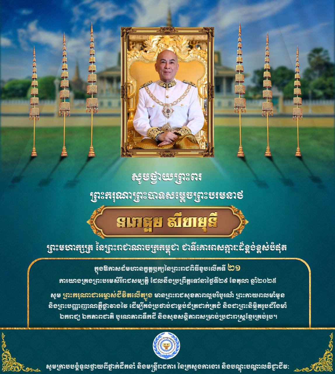 សូមថ្វាយព្រះពរ ព្រះករុណា ព្រះបាទសម្តេចព្រះបរមនាថ នរោត្តម សីហមុនី ព្រះមហាក្សត្រ នៃព្រះរាជាណាចក្រកម្ពុជា ជាទីគោរពសក្ការៈដ៏ខ្ពង់ខ្ពស់បំផុត ក្នុងឱកាសខួបលើកទី ២១ នៃការយាងឡើងគ្រងព្រះបរមសិរីរាជសម្បត្តិ ថ្ងៃទី២៩ ខែតុលា ឆ្នាំ២០២៥។