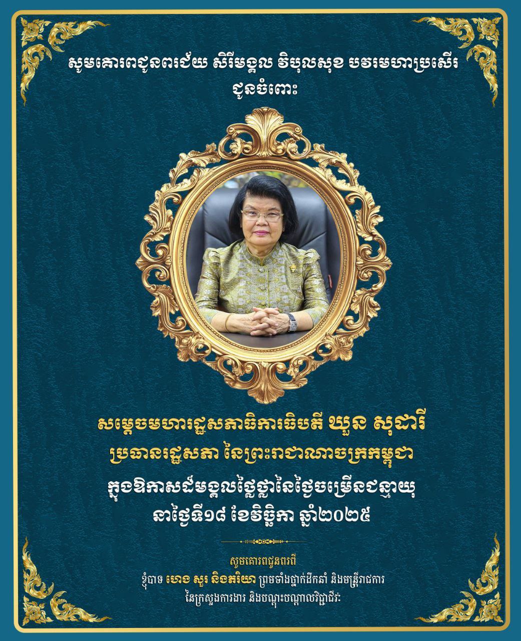ឯកឧត្តម ហេង សួរ និងភរិយា ព្រមទាំងថ្នាក់ដឹកនាំ និងមន្ត្រីរាជការគ្រប់លំដាប់ថ្នាក់នៃក្រសួងការងារ និងបណ្តុះបណ្តាលវិជ្ជាជីវៈ សូមប្រសិទ្ធពរជ័យគោរពជូនចំពោះ សម្តេចមហារដ្ឋសភាធិការធិបតី ឃួន សុដារី ប្រធានរដ្ឋសភា នៃព្រះរាជាណាចក្រកម្ពុជា ក្នុងឱកាសជ័យមង្គលនៃខួបចម្រើនជន្មាយុរបស់ សម្តេចមហារដ្ឋសភាធិការធិបតី ដែលប្រព្រឹត្តទៅនាថ្ងៃអង្គារ ទី១៨ ខែវិច្ឆិកា ឆ្នាំ២០២៥នេះ។