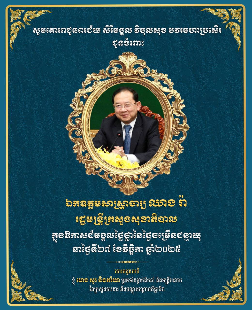 ឯកឧត្តម ហេង សួរ និងភរិយា ព្រមទាំងថ្នាក់ដឹកនាំ និងមន្ត្រីរាជការគ្រប់លំដាប់ថ្នាក់ នៃក្រសួងការងារ និងបណ្តុះបណ្តាលវិជ្ជាជីវៈ សូមប្រសិទ្ធពរជ័យគោរពជូនចំពោះ ឯកឧត្តមសាស្ត្រាចារ្យ ឈាង រ៉ា រដ្ឋមន្ត្រីក្រសួងសុខាភិបាល ក្នុងឱកាសជ័យមង្គលនៃខួបចម្រើនជន្មាយុ ដែលប្រព្រឹត្តទៅនាថ្ងៃព្រហស្បតិ៍ ទី២៧ ខែវិច្ឆិកា ឆ្នាំ២០២៥នេះ។
