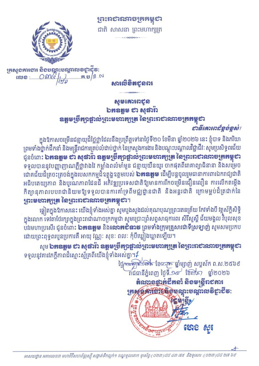 ឯកឧត្តម ហេង សួរ និងភរិយា ព្រមទាំងថ្នាក់ដឹកនាំ និងមន្ត្រីរាជការ នៃក្រសួងការងារ និងបណ្តុះបណ្តាលវិជ្ជាជីវៈ សូមប្រសិទ្ធពរជ័យគោរពជូនចំពោះ ឯកឧត្តម ជា សុផារ៉ា ឧត្តមប្រឹក្សាផ្ទាល់ព្រះមហាក្សត្រ នៃព្រះរាជាណាចក្រកម្ពុជា ក្នុងឱកាសចម្រើនជន្មាយុដ៏ថ្លៃថ្លា ដែលប្រព្រឹត្តទៅនាថ្ងៃទី២០ ខែមីនា ឆ្នាំ២០២៦។
