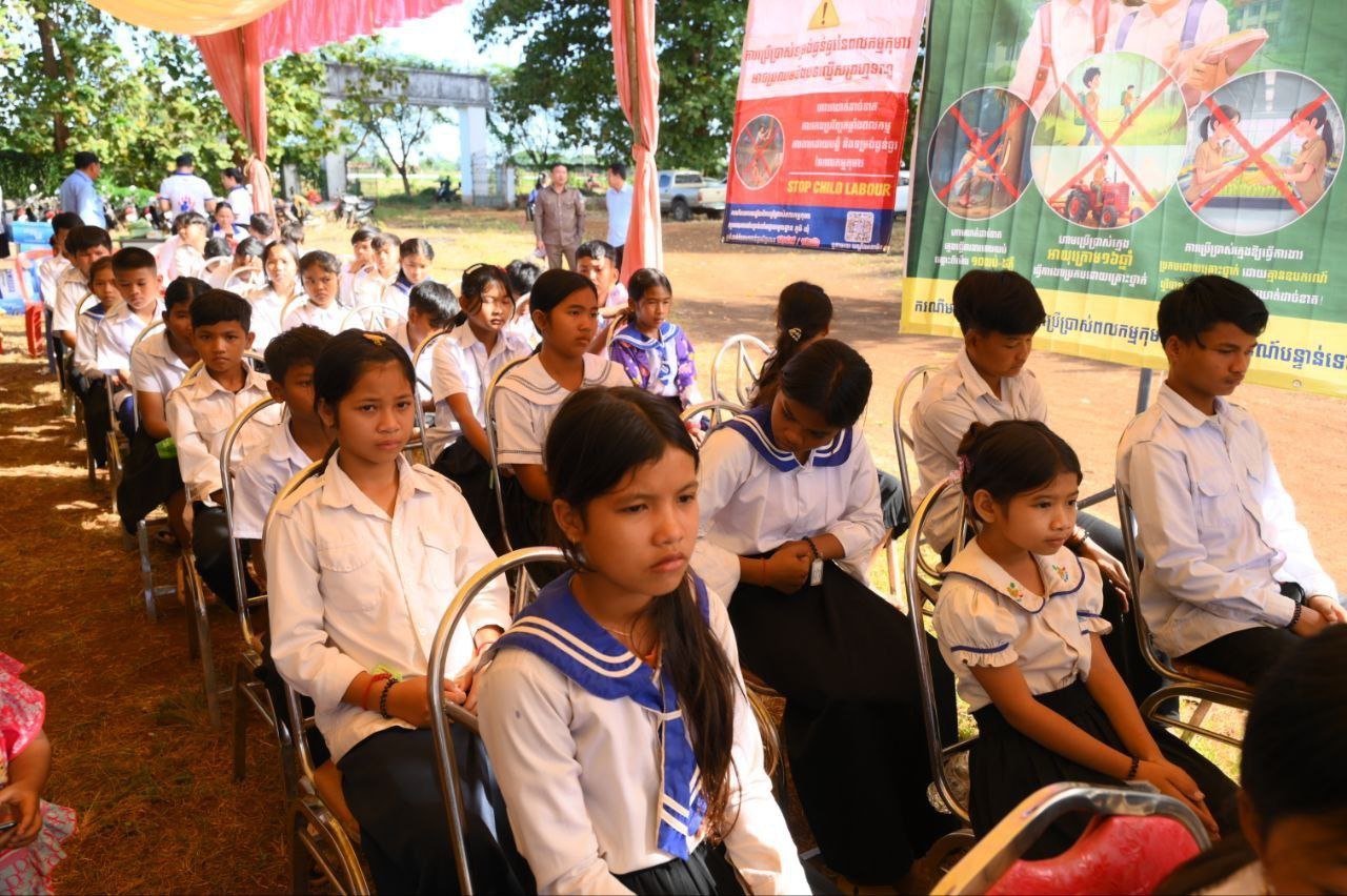 (កំពង់ចាម)៖ "ការវិនិយោគលើកុមារថ្ងៃនេះ គឺជាការវិនិយោគលើអនាគត" ដោយឡែកការលុបបំបាត់ទម្រង់ធ្ងន់ធ្ងរនៃពលកម្មកុមារ គឺជាបញ្ហាអាទិភាពដែលត្រូវមានការប្តេជ្ញាចិត្តរួមគ្នា និងទាមទារនូវការចូលរួមយ៉ាងសកម្មពីគ្រប់ភាគីពាក់ព័ន្ធ។ នេះជាការលើកឡើងរបស់ឯកឧត្តម វ៉េង ហៀង អនុរដ្ឋលេខាធិការ តំណាងដ៏ខ្ពង់ខ្ពស់ ឯកឧត្តម ហេង សួរ រដ្ឋមន្រ្តីក្រសួងការងារ និងបណ្ដុះបណ្ដាលវិជ្ជាជីវៈ និងជាប្រធានគណៈ:កម្មាធិការជាតិប្រឆាំងពលកម្មកុមារ ក្នុងកម្មវិធីចែកសម្ភារៈសិក្សា មធ្យោបាយធ្វើដំណើរ និងពូជបន្លែ ជូនដល់កុមារ និងក្រុមគ្រួសារគោលដៅ ដែលបានទប់ស្កាត់ និងការពារពីការប្រើប្រាស់ពលកម្មកុមារ នៅស្រុកចំការលើ និងស្រុកបាធាយ ខេត្តកំពង់ចាម នាថ្ងៃទី៥ ខែធ្នូ ឆ្នាំ២០២៥។