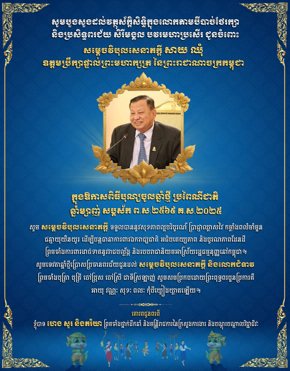 ក្នុងឱកាសពិធីបុណ្យចូលឆ្នាំថ្មីប្រពៃណីជាតិ ឆ្នាំម្សាញ់ សប្ដស័ក ព.ស.២៥៦៩ គ.ស.២០២៥ ឯកឧត្តម ហេង សួរ និងលោកជំទាវ ព្រមទាំងថ្នាក់ដឹកនាំ និងមន្ត្រីរាជការគ្រប់លំដាក់ថ្នាក់ នៃក្រសួងការងារ និងបណ្តុះបណ្តាលវិជ្ជាជីវៈ សូមបួងសួងដល់ទេវតាឆ្នាំថ្មី ព្រះនាងគោរាគទេវី សូមជួយអភិបាលប្រោះព្រំប្រទានព្រះរាជសព្ទសាធុការពរជ័យ សិរីសួស្តី ជ័យមង្គល វិបុលសុខ បវរមហាប្រសើរ ជូនចំពោះសម្ដេចវិបុលសេនាភក្ដី សាយ ឈុំ ឧត្តមប្រឹក្សាផ្ទាល់ព្រះមហាក្សត្រ នៃព្រះរាជាណាចក្រកម្ពុជា សូមសមប្រកបដោយព្រះពុទ្ធពរទាំងបួនប្រការ គឺ អាយុ វណ្ណៈ សុខៈ ពលៈ កុំបីឃ្លៀងឃ្លាតឡើយ។