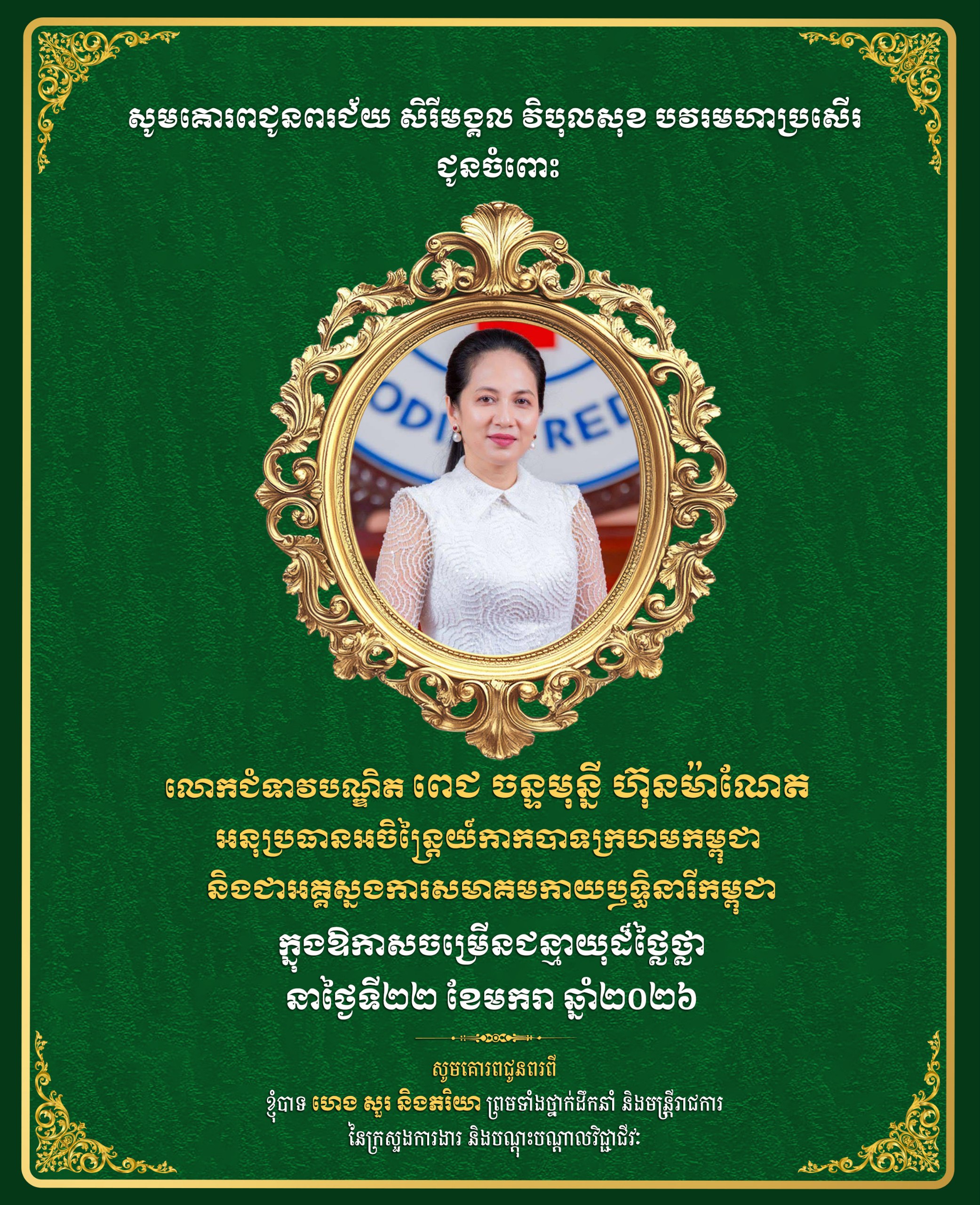 ឯកឧត្តម ហេង សួរ និងភរិយា ព្រមទាំងថ្នាក់ដឹកនាំ និងមន្ត្រីរាជការ នៃក្រសួងការងារ និងបណ្តុះបណ្តាលវិជ្ជាជីវៈ សូមប្រសិទ្ធពរជ័យគោរពជូនចំពោះ លោកជំទាវបណ្ឌិត ពេជ ចន្ទមុន្នី ហ៊ុនម៉ាណែត អនុប្រធានអចិន្ត្រៃយ៍កាកបាទក្រហមកម្ពុជា និងជាអគ្គស្នងការសមាគមកាយឫទ្ធិនារីកម្ពុជា ក្នុងឱកាសចម្រើនជន្មាយុដ៏ថ្លៃថ្លា ដែលប្រព្រឹត្តទៅនាថ្ងៃទី២២ ខែមករា ឆ្នាំ២០២៦។