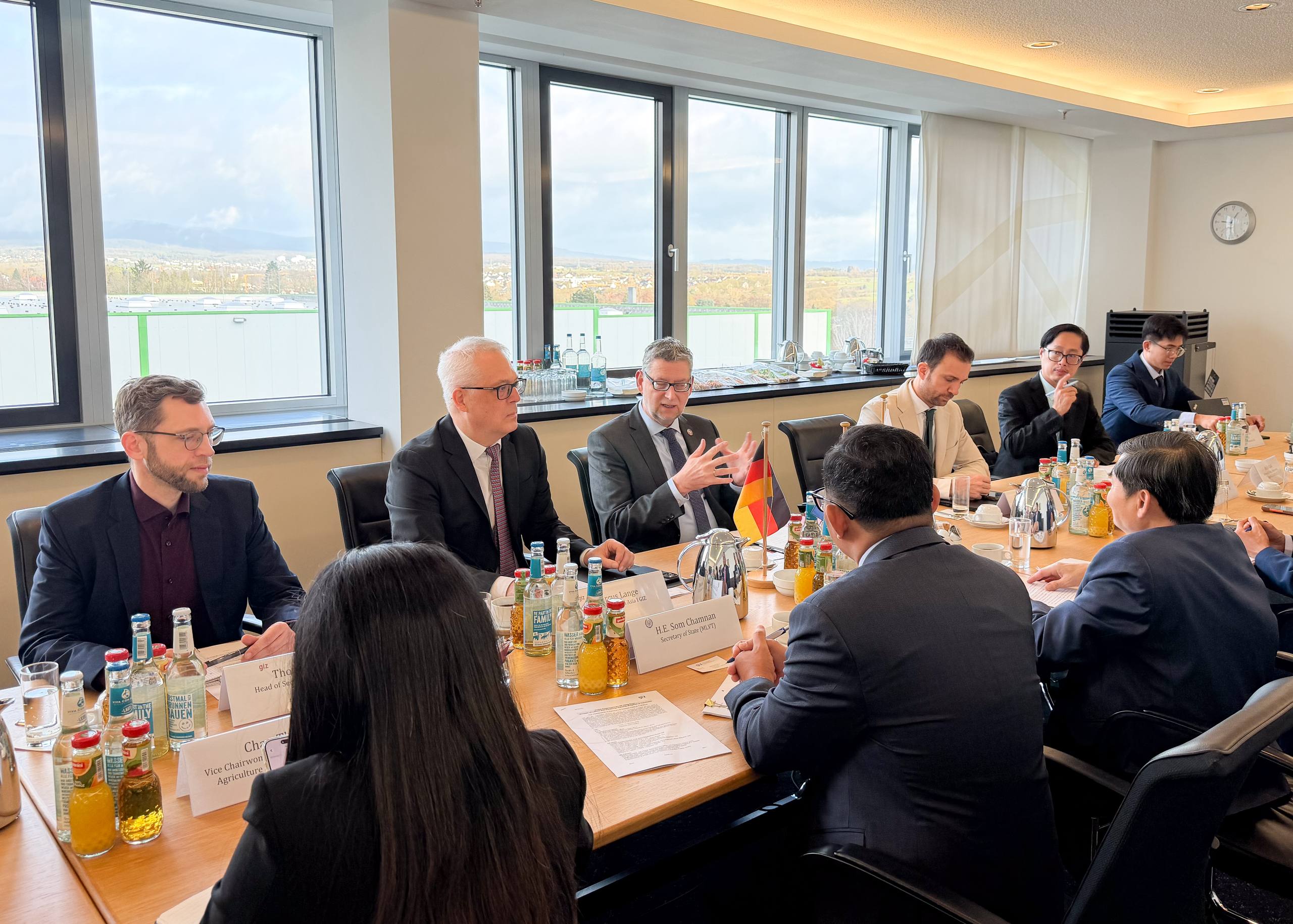 នៅក្នុងឱកាសនោះ ប្រតិភូបានជួបពិភាក្សាការងារជាមួយលោក ថស៍ស្ទីន ហ្សាវហ្វឺ ហ្គាមបល (Thorsten Schafer Gumbel) ប្រធានក្រុមប្រឹក្សាភិបាលនៃទីភ្នាក់ងារសហប្រតិបត្តិការអាល្លឺម៉ង់ (GIZ) ដែលនៅក្នុងជំនួបនោះភាគីទាំងពីរបានរំលឹកពីចំណងមិត្តភាពការទូតដ៏យូរលង់ និងកិច្ចសហប្រតិបត្តិការដ៏ល្អរវាងកម្ពុជា និងអាល្លឺម៉ង់។ ភាគីទាំងពីរក៏បានឯកភាពគ្នាក្នុងការបន្តពង្រឹងកិច្ចសហប្រតិបត្តិការលើវិស័យការងារ សន្តិសុខសង្គម និងបណ្តុះបណ្តាលវិជ្ជាជីវៈ ជាពិសេសលើការលើកកម្ពស់ការអភិវឌ្ឍជំនាញ ដែលជាកត្តាចាំបាច់សម្រាប់កម្ពុជាក្នុងការបន្តរក្សាបាននូវភាពប្រកួតប្រជែងនៅពេលកម្ពុជាបានចាកចេញពីប្រទេសអភិវឌ្ឍតិចតួច (LDC)។