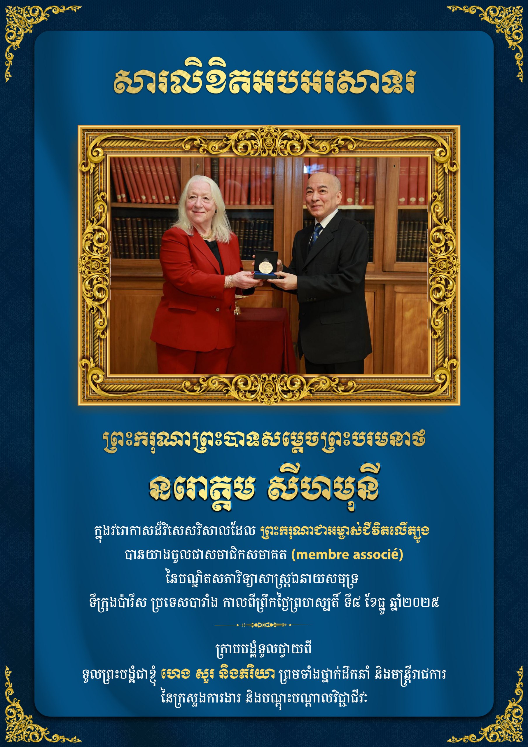 គោរពថ្វាយព្រះករុណាព្រះបាទសម្តេចព្រះបរមនាថ នរោត្តម សីហមុនី ព្រះមហាក្សត្រ នៃព្រះរាជាណាចក្រកម្ពុជា ក្នុងឱកាសដ៏វិសេសវិសាល ព្រះករុណាជាអម្ចាស់ជីវិតលើត្បូង បានចូលជាសមាជិកសមាគត (membre associé) នៃបណ្ឌិតសភាវិទ្យាសាស្ត្រឯនាយសមុទ្រ នៅទីក្រុងប៉ារីស ប្រទេសបារាំងកាលពីព្រឹកថ្ងៃព្រហស្បតិ៍ ទី៤ ខែធ្នូ ឆ្នាំ២០២៥។