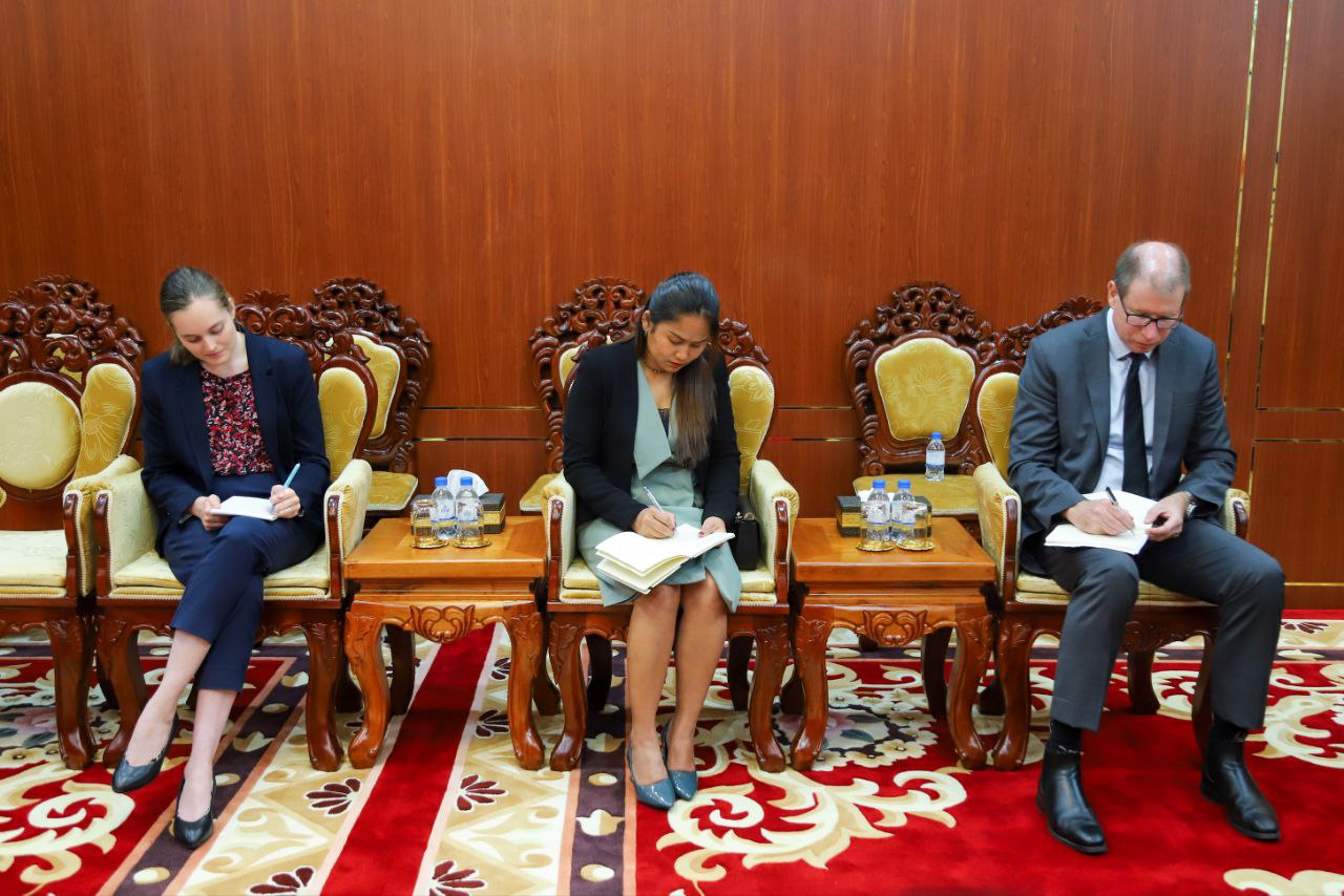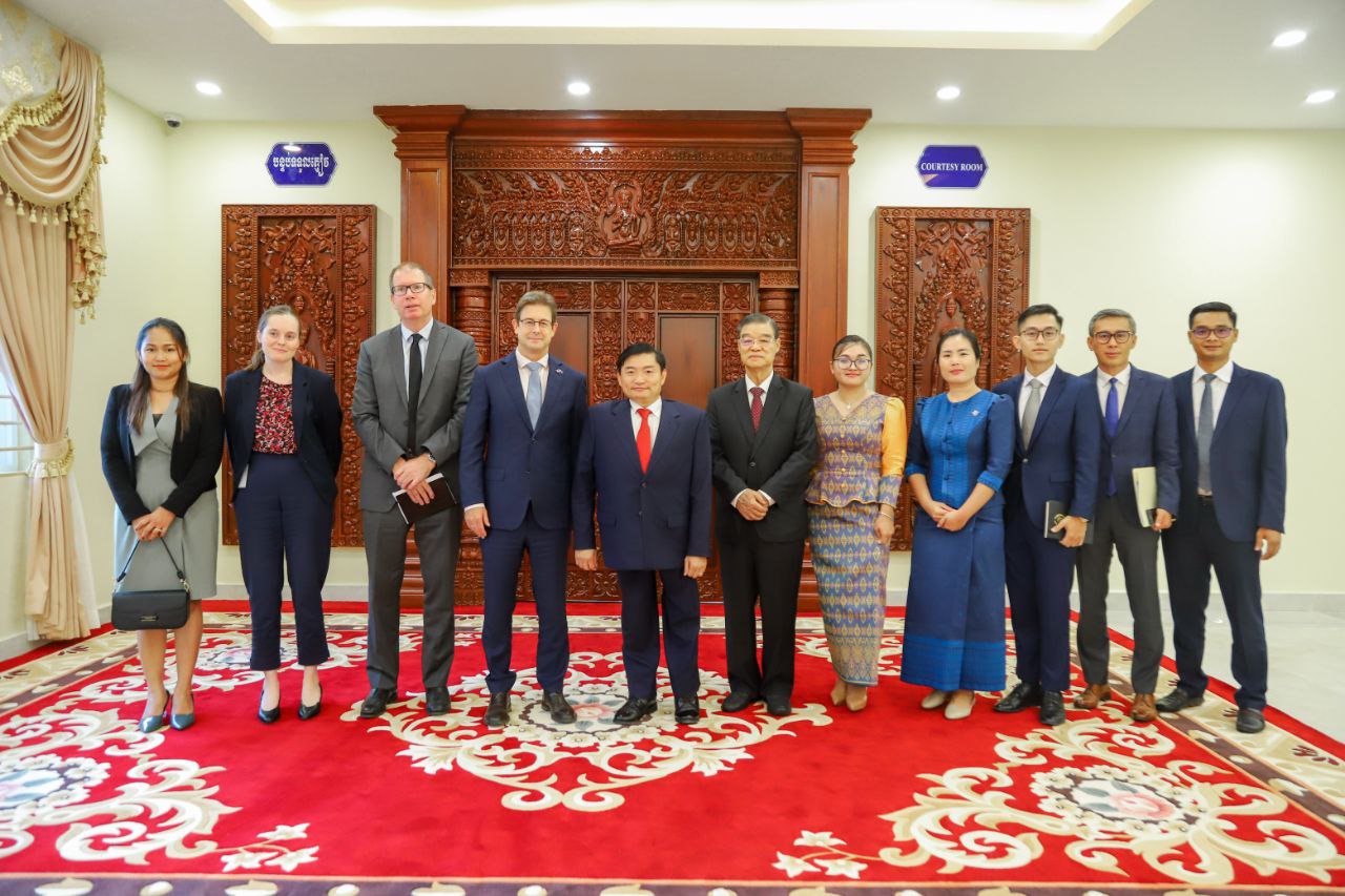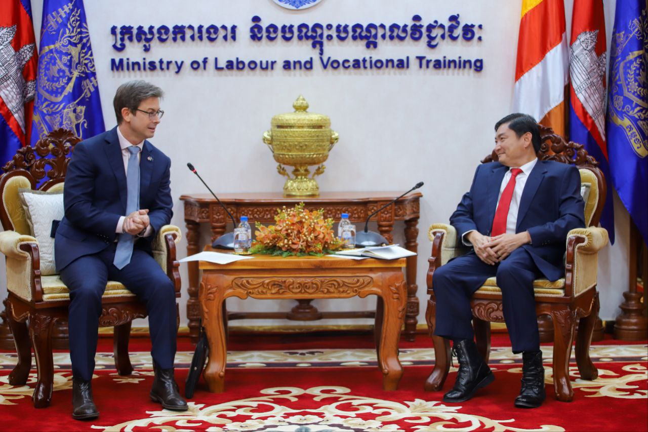 (ភ្នំពេញ)៖ ឯកឧត្តម ហេង សួរ រដ្ឋមន្ត្រីក្រសួងការងារ និងបណ្តុះបណ្តាលវិជ្ជាជីវៈ នារសៀលថ្ងៃទី៨ ខែវិច្ឆិកា ឆ្នាំ២០២៣នេះ បានជួបពិភាក្សាការងារជាមួយនឹងឯកឧត្តម Justin Whyatt (ចាស្ទីន វ៉ាយអេត) ឯកអគ្គរដ្ឋទូតអូស្ត្រាលីប្រចាំព្រះរាជាណាចក្រកម្ពុជា នៅទីស្តីការក្រសួង។