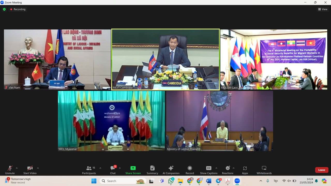 (ភ្នំពេញ)៖ នៅទីស្តីការក្រសួងការងារ និងបណ្តុះបណ្តាលវិជ្ជាជីវៈ ឯកឧត្តម គួច សុមាន រដ្ឋលេខាធិការ តំណាងដ៏ខ្ពង់ខ្ពស់ ឯកឧត្តម ហេង សួរ រដ្ឋមន្រ្តីក្រសួងការងារ និងបណ្តុះបណ្តាលវិជ្ជាជីវៈ នៅរសៀលថ្ងៃព្រហស្បតិ៍ ទី២៣ ខែឧសភា ឆ្នាំ២០២៤ បានចូលរួមកិច្ចប្រជុំរដ្ឋមន្រ្តីការងារលើកទី៤ នៃប្រទេសកម្ពុជា ឡាវ មីយ៉ាន់ម៉ា ថៃ និងវៀតណាម (CLMTV) ស្តីពីចល័តភាពរបបសន្តិសុខសង្គមសម្រាប់ទេសន្តរប្រវេសនករក្នុងប្រទេស”។ កិច្ចប្រជុំដែលធ្វើឡើងតាមរយៈប្រព័ន្ធវីដេអូ ដឹកនាំដោយលោកជំទាវ បាយខាំ ខាត់ធីយ៉ា រដ្ឋមន្រ្តីក្រសួងការងារ និងសុខុមាលភាពសង្គមនៃសាធារណរដ្ឋប្រជាធិបតេយ្យប្រជាមានិតឡាវ និងមានការចូលរួមពីគណៈប្រតិភូជាន់ខ្ពស់ពីប្រទេសCLMTV ។
