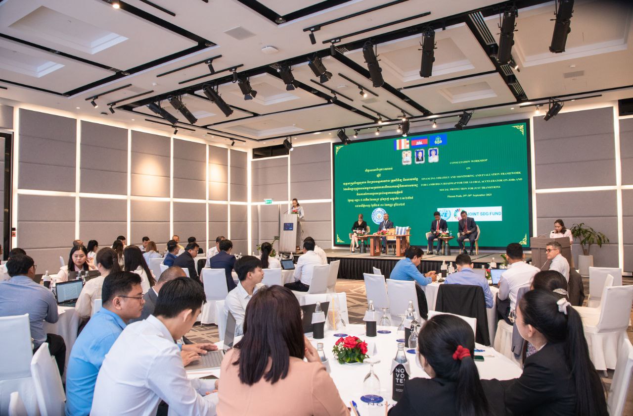 (ភ្នំពេញ)៖ លោកជំទាវ សុវណ្ណ វណ្ណារតន៍ រដ្ឋលេខាធិការប្រចាំការ តំណាងដ៏ខ្ពង់ខ្ពស់ ឯកឧត្តម ហេង សួរ រដ្ឋមន្រ្តីក្រសួងការងារ និងបណ្ដុះបណ្ដាលវិជ្ជាជីវៈ បានអញ្ជើញជាអធិបតីភាពក្នុងពិធីបើក "សិក្ខាសាលាពិគ្រោះយោបល់ស្តីពី យុទ្ធសាស្រ្ដហិរញ្ញប្បទាន និងក្របខណ្ឌតាមដាន ត្រួតពិនិត្យ និងវាយតម្លៃផែនទីបង្ហាញផ្លូវរបស់កម្ពុជាសម្រាប់កាតាលីករសកលស្តីពី ការងារសមរម្យនិងការគាំពារសង្គមសម្រាប់អន្តរកាលយុត្តិធម៌" ក្រោមការសហការរៀបចំដោយក្រសួងការងារ និងបណ្តុះបណ្តាលវិជ្ជាជីវ: កម្មវិធីអភិវឌ្ឍន៍សហប្រជាតិ (UNDP) និងអង្គការអន្តរជាតិខាងការងារ (ILO) នាព្រឹកថ្ងៃទី២៩ ខែកញ្ញា ឆ្នាំ២០២៥ នៅសណ្ឋាគារ Novotel Phnom Penh ព្រមទាំងមានការចូលរួមពីតំណាងក្រសួង-ស្ថាប័ន ដែលជាសមាជិកក្រុមការងារអន្តរក្រសួងទទួលបន្ទុកជំរុញការអនុវត្តផែនទីបង្ហាញផ្លូវរបស់បកម្ពុជាសម្រាប់កាតាលីករសកលស្តីពីការងារសមរម្យនិងការគាំពារសង្គមសម្រាប់អន្តរកាលយុត្តិធម៌ និងតំណាងដៃគូអភិវឌ្ឍន៍ពាក់ព័ន្ធសរុប ៦០រូប។
