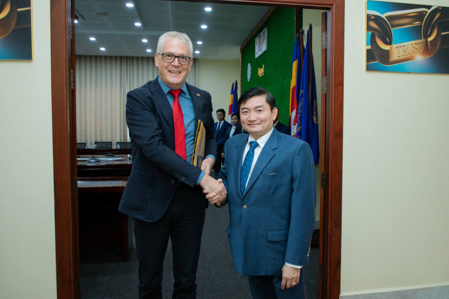(ភ្នំពេញ)៖ ឯកឧត្តម ហេង សួរ រដ្ឋមន្ត្រីក្រសួងការងារ និងបណ្តុះបណ្តាលវិជ្ជាជីវៈ បានទទួលជួបសម្តែងការគួរសម ជាមួយប្រតិភូទីភ្នាក់ងារកិច្ចសហប្រតិបត្តិការអាល្លឺម៉ង់ (GIZ) ដែលដឹកនាំដោយលោក Marcus Lange នាយកផ្នែកតំបន់អាស៊ីរបស់ GIZ និងមានការចូលរួមពីលោកបណ្ឌិត Matthias Bickel ដែលត្រូវបានតែងតាំងជាប្រធានថ្មី របស់ GIZ ប្រចាំប្រទេសកម្ពុជា នារសៀលថ្ងៃទី១៦ ខែតុលា ឆ្នាំ២០២៥ នៅទីស្តីការក្រសួងការងារ ដើម្បីពង្រឹងកិច្ចសហប្រតិបត្តិការរវាងស្ថាប័នទាំងពីរ ឱ្យកាន់តែស៊ីជម្រៅលើវិស័យការងារ សន្តិសុខសង្គម និងបណ្តុះបណ្តាលវិជ្ជាជីវៈ។