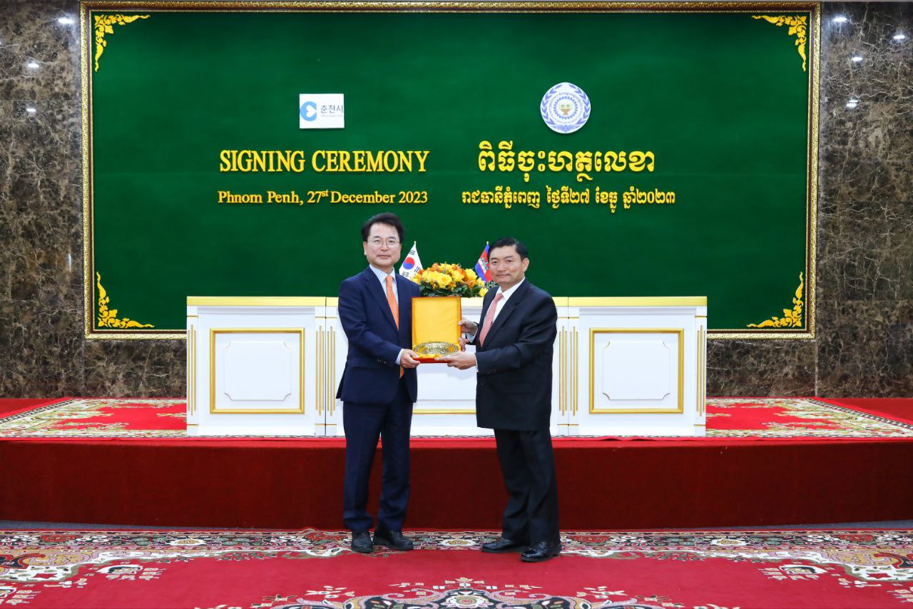 (ភ្នំពេញ)៖ រដ្ឋមន្ត្រីក្រសួងការងារ និងបណ្តុះបណ្តាលវិជ្ជាជីវៈ នៅព្រឹកថ្ងៃទី២៧ ខែធ្នូ ឆ្នាំ២០២៣នេះ បានចុះអនុស្សរណៈយោគយល់គ្នាជាមួយនឹងអភិបាលក្រុងឈុនឆន់ ខេត្តកាំងវ៉ុននៃធារណរដ្ឋកូរ៉េ ដើម្បីផ្តល់ឱកាសជូនពលរដ្ឋកម្ពុជាដែលមានបំណងទៅធ្វើការជាពលកររដូវកាលនៅសាធារណរដ្ឋកូរ៉េ។ ពិធីចុះអនុស្សរណៈនេះ គឺធ្វើឡើងនៅទីស្តីការក្រសួងការងារ និងបណ្តុះបណ្តាលវិជ្ជាជីវៈ។