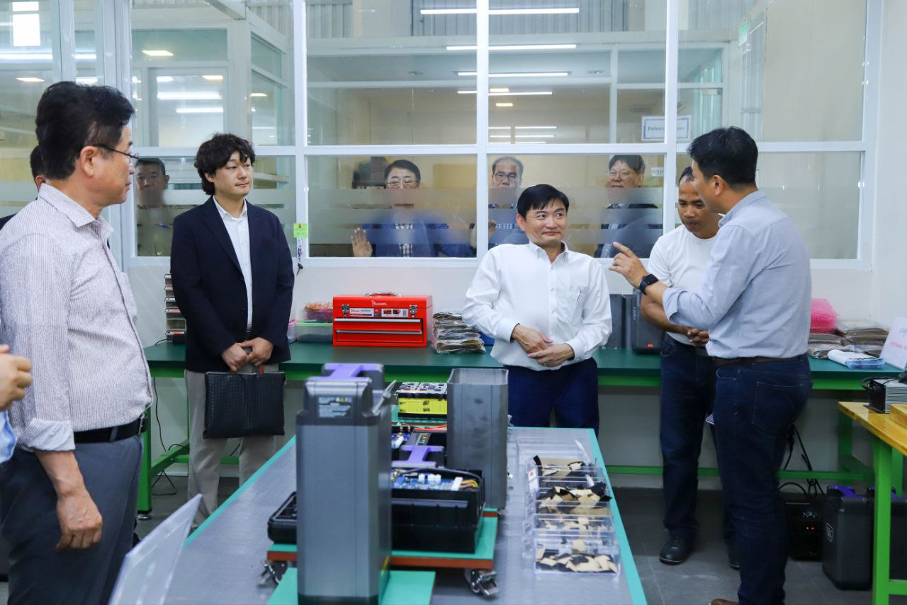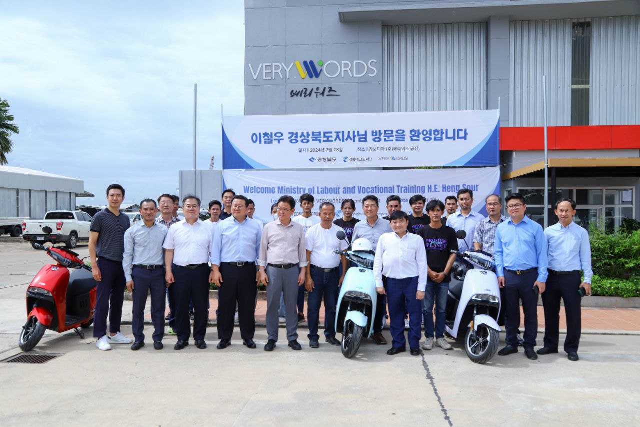(ភ្នំពេញ)៖ ឯកឧត្តម ហេង សួរ រដ្ឋមន្ត្រីក្រសួងការងារ និងបណ្តុះបណ្តាលវិជ្ជាជីវៈ និងឯកឧត្តម Lee Cheol-Woo អភិបាលខេត្តក្យង់សាំងប៊ូកដូនៃសាធារណរដ្ឋកូរ៉េ នៅរសៀលថ្ងៃអាទិត្យ ទី២៨ ខែកក្កដា ឆ្នាំ២០២៤នេះ បានអញ្ជើញចុះពិនិត្យមើលសង្វាក់ផលិតកម្មរោងចក្រផ្គុំដំឡើង ម៉ូតូ កង់ រ៉ឺម៉កដែលដើរដោយថាមពលអគ្គិសនី និងឧបករណ៍បញ្ចូល ឬសាកថ្មដែលជាការវិនិយោគរបស់វិនិយោគិនកូរ៉េខាងត្បូងដែលមានទីតាំងនៅតាមបណ្តោយផ្លូវជាតិលេខ១ ក្នុងស្រុកកៀនស្វាយ ខេត្តកណ្ដាល។