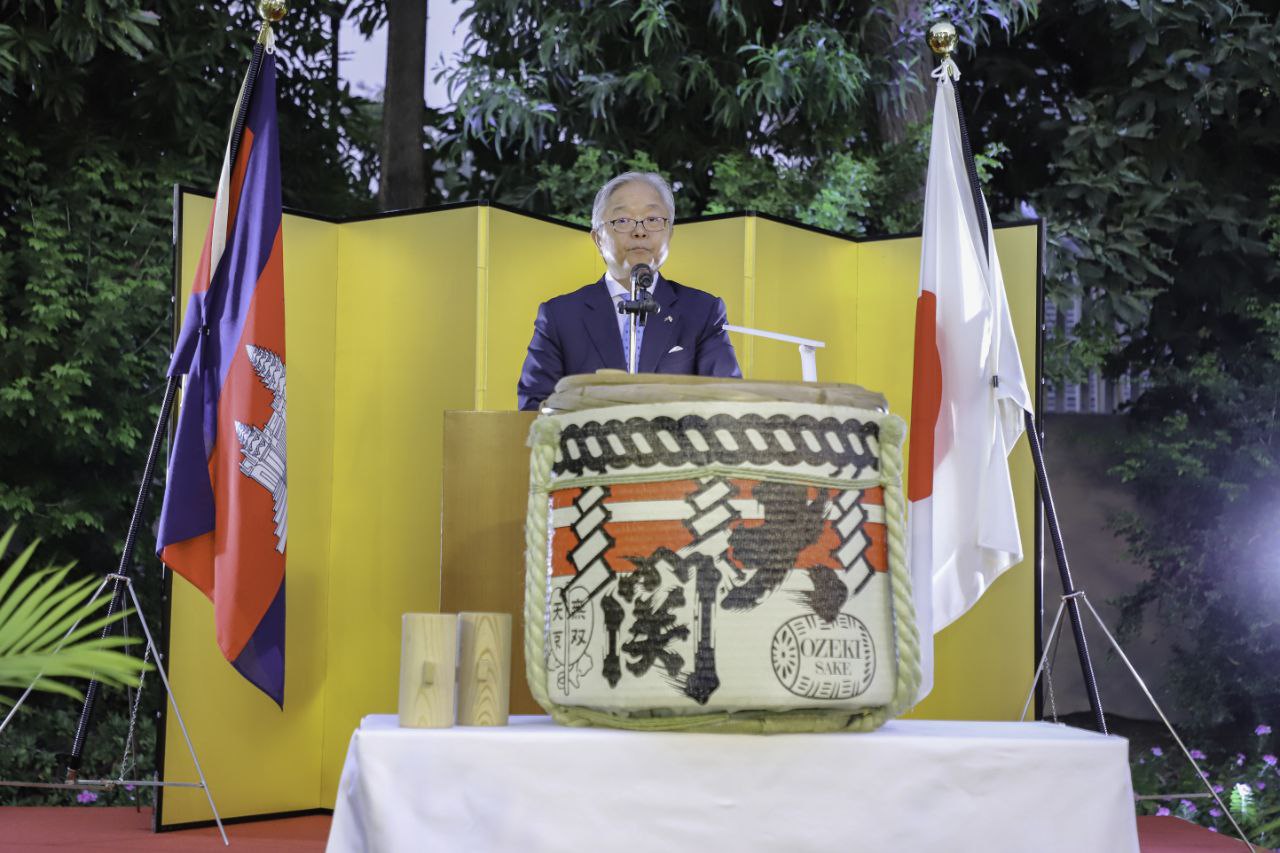 ឯកឧត្តមឯកអគ្គរាជទូតជប៉ុន UENO Atsushi បានឡើងថ្លែងសុន្ទរកថាស្វាគមន៍ភ្ញៀវកិត្តិយសដែលសុទ្ធសឹងតែជាមន្ត្រីជាន់ខ្ពស់នៃរាជរដ្ឋាភិបាលកម្ពុជា និងអ្នកជំនួញជាដើម។