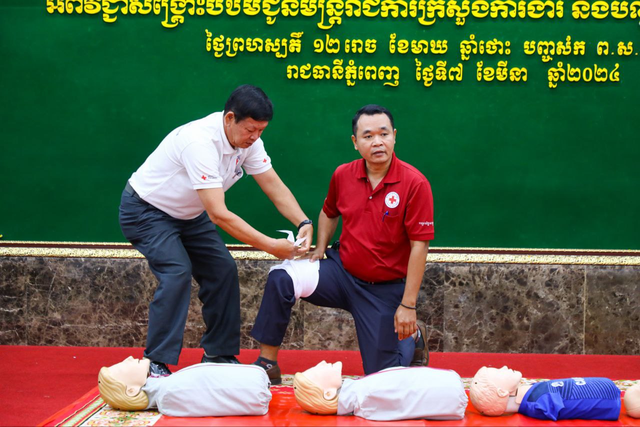 ក្នុងគោលបំណងឈានឆ្ពោះឱ្យគ្រួសារមួយមានអ្នកយល់ដឹងអំពីវិជ្ជាសង្គ្រោះបឋម តាមយុទ្ធសាស្ត្រ ២០២១-២០៣០ កាកបាទក្រហមកម្ពុជា នាព្រឹកថ្ងៃទី៧ ខែមីនា ឆ្នាំ២០២៤ បានចុះផ្សព្វផ្សាយវិជ្ជាសង្គ្រោះបឋមតាមលក្ខណៈបច្ចេកទេសត្រឹមត្រូវ ប្រកបដោយប្រសិទ្ធភាព ជូនដល់មន្ត្រីរាជការនៃក្រសួងការងារ និងបណ្តុះបណ្តាលវិជ្ជាជីវៈ ឱ្យយល់ដឹងអំពីការសង្គ្រោះភ្លាមៗ ដែលជាចំណេះដឹងមានសារៈប្រយោជន៍អាចជួយសង្គ្រោះអាយុជីវិត នៅពេលមានគ្រោះថ្នាក់ជាយថាហេតុ នៅគ្រប់កាលៈទេសៈ និងគ្រប់ទីកន្លែង៕