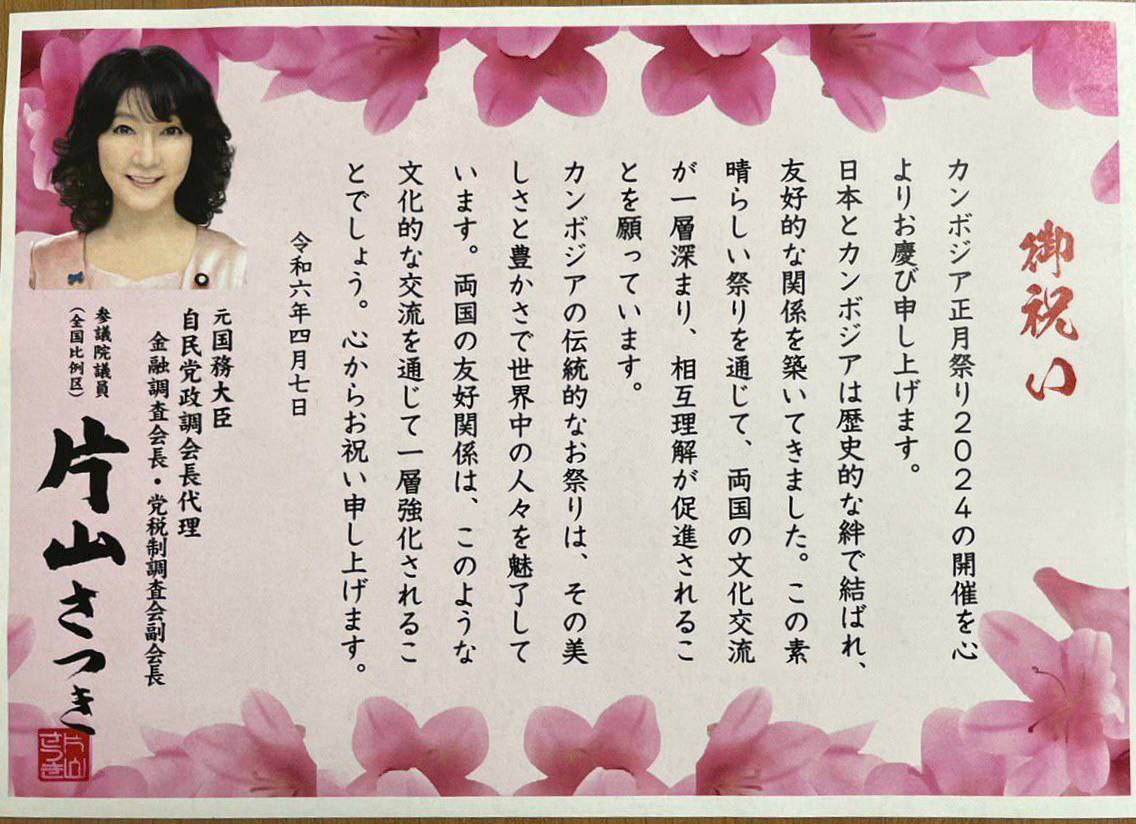 លោកជំទាវ កាតាយាម៉ា សាតសុគិ(KATAYAMA SATSUKI) សមាជិកព្រឹទ្ធសភា និងជាប្រធានគណៈកម្មការកិច្ចការស្រាវជ្រាវហហិរញ្ញវត្ថុ និងជាអនុប្រធានគណៈកម្មការស្រាវជ្រាវប្រព័ន្ធពន្ធនៃគណបក្សប្រជាធិបតេយ្យសេរី(LDP)ដែលជាបក្សកាន់អំណាចនៅជប៉ុន បានបង្ហាញជំនឿយ៉ាងមុតមាំថា ព្រឹត្តិការណ៍សង្រ្កាន្តខ្មែរនៅជប៉ុននេះ នឹងចូលរួមចំណែកក្នុងការផ្លាស់ប្តូរ និងចែករំលែកវប្បធ៌ម ព្រមទាំងពង្រឹងចំណងមិត្តភាពនៃប្រទេសទាំងពីរឱ្យកាន់តែរឹងមាំថែមមួយកម្រិតទៀត។ សម្រាប់លោកជំទាវ ព្រឹត្តិការណ៍សង្រ្កាន្តខ្មែរនេះ បានបង្ហាញពីភាពឥតខ្ចោះ និងភាពសម្បូររុងរឿងនៃប្រពៃណីវប្បធ៌មខ្មែរដែលបានល្បីរន្ទឺទូទាំងសកលលោក។