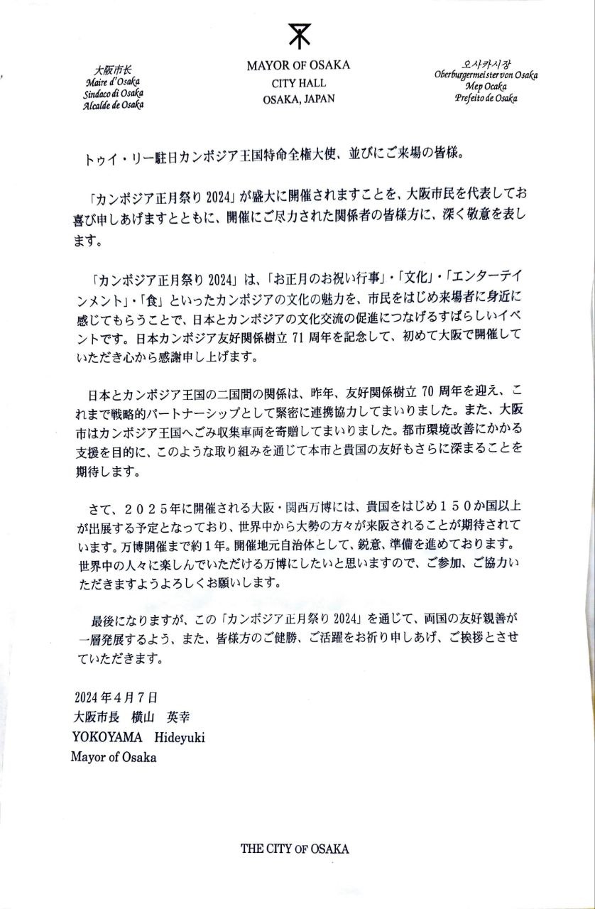 ទន្ទឹមនឹងនេះ អភិបាលក្រុងអូសាកា លោកយូកូយ៉ាម៉ា ហៃដេយូកិ(YOKOYAMA Hideyuki)វិញ ក៏សង្កត់ធ្ងន់ថា ព្រឹត្តការណ៍សង្ក្រាន្តខ្មែរនៅជប៉ុនឆ្នាំ២០២៤នេះ បានពាំនាំនូវប្រពៃណីនៃការប្រារព្ធពិធីបុណ្យសង្រ្កាន្តខ្មែរ, វប្បធ៌ម, ល្បែងប្រជាប្រិយ, និងម្ហូបខ្មែរ ដែលសុទ្ធសឹងជាកិត្យានុពលភាពនៃវប្បធ៌មខ្មែរ មកបង្ហាញជូនប្រជាពលរដ្ឋនៃក្រុងអូសាកា ព្រមទាំងអ្នកចូលរួមក្នុងព្រឹត្តិការណ៍ទាំងអស់ឱ្យឈ្វេងយល់ ហើយព្រឹត្តិការណ៍ដ៏ល្អផូរផង់នេះ បានចូលរួមចំណែកយ៉ាងធំធេងក្នុងការជំរុញកិច្ចសហប្រតិបត្តិការវប្បធ៌មនៃប្រទេសជប៉ុននិងប្រទេសកម្ពុជា។
