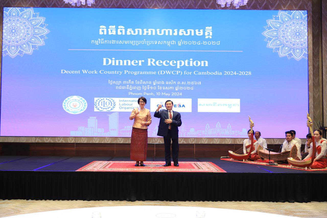 (ភ្នំពេញ)៖ ឯកឧត្តម ហេង សួរ រដ្ឋមន្ត្រីក្រសួងការងារ និងបណ្តុះបណ្តាលវិជ្ជាជីវៈ នៅល្ងាចថ្ងៃទី១០ ខែឧសភា ឆ្នាំ២០២៤នេះ បានរៀបចំពិធីអាហារសាមគ្គីជាមួយនឹងតំណាងអង្គការអន្តរជាតិខាងការងារ(ILO) ដែលដឹកនាំដោយលោកស្រី Chihoko Asada-Miyakawa ឧបការីអគ្គនាយកអង្គការអន្តរជាតិខាងការងារ និងជានាយិកាប្រចាំតំបន់អាស៊ី និងប៉ាស៊ីហ្វិក នៃអង្គការ ILO និងសហការី, តំណាងកម្មករនិយោជិតដែលមានលោកសំ សឿន ប្រធានសហភាពពលកម្មកជាតិកម្ពុជា (NLC), និងតំណាងសមាគមនិយោជក ឧកញ៉ា សុខ ពិសិដ្ឋ ប្រធានសហព័ន្ធនិយោជក និងសមាគមពាណិជ្ជកម្មកម្ពុជា, និងមន្ត្រីជាន់ខ្ពស់របស់រាជរដ្ឋាភិបាលដែលមកពីក្រសួងសេដ្ឋកិច្ចនិងហិរញ្ញវត្ថុ ក្រសួងពាណិជ្ជកម្ម ក្រសួងអប់រំយុវជននិងកីឡា ក្រសួងឧស្សាហ កម្ម វិទ្យាសាស្ត្រ បច្ចេកវិទ្យា និង នវានុវត្តន៍ ក្រសួងមហាផ្ទៃ ក្រសួងទេសចរណ៍ ក្រសួងការបរទេស និងសហប្រតិបត្តិការអន្តរជាតិ ក្រសួងកិច្ចការនារី និងក្រសួងរៀបចំដែនដី នគររូបនីយកម្ម និងសំណង់ រួមទាំងភ្ញៀវកិត្តិយសជាច្រើនផ្សេងទៀតផងដែរ។