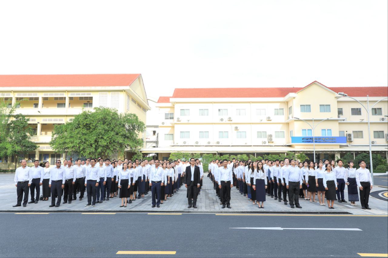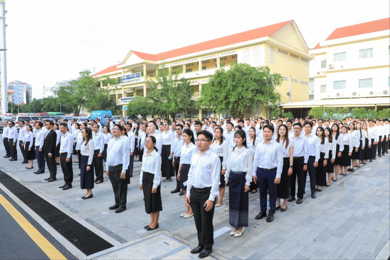 នាព្រឹកថ្ងៃចន្ទទី២២ ខែកក្កដា ឆ្នាំ២០២៤នេះ ថ្នាក់ដឹកនាំ និងមន្ត្រីរាជការនៃក្រសួងការងារ និងបណ្តុះបណ្តាលវិជ្ជាជីវៈ បានចូលរួមគោរពទង់ជាតិនៃព្រះរាជាណាចក្រកម្ពុជា ដោយច្រៀងចម្រៀងបទ «នគររាជ» និងច្រៀងបទ «ពង្សាវតារខ្មែរ» ដោយផ្ទាល់រួមគ្នា។