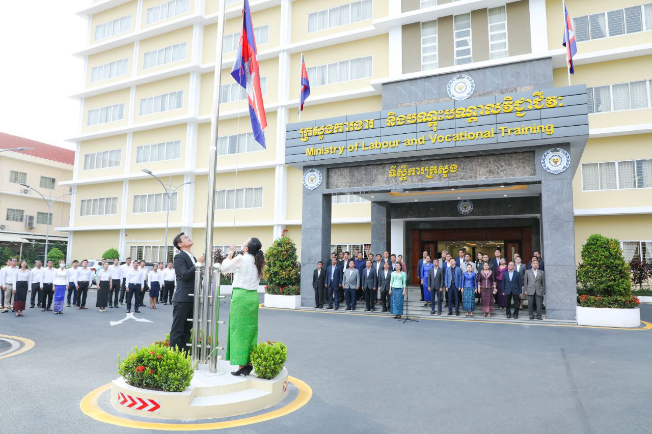 សូមជម្រាបជូនថា ក្រសួងការងារ និងបណ្តុះបណ្តាលវិជ្ជាជីវៈ បានរៀបចំកម្មវិធីគោរពទង់ជាតិមានចំនួនពីរដងក្នុងមួយសប្តាហ៍ ដែលត្រូវធ្វើឡើងជារៀងរាល់ម៉ោង ៧ព្រឹកនៃថ្ងៃចន្ទ និងរៀងរាល់ម៉ោង ៥ល្ងាចនៃថ្ងៃសុក្រ៕
