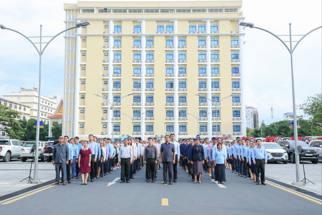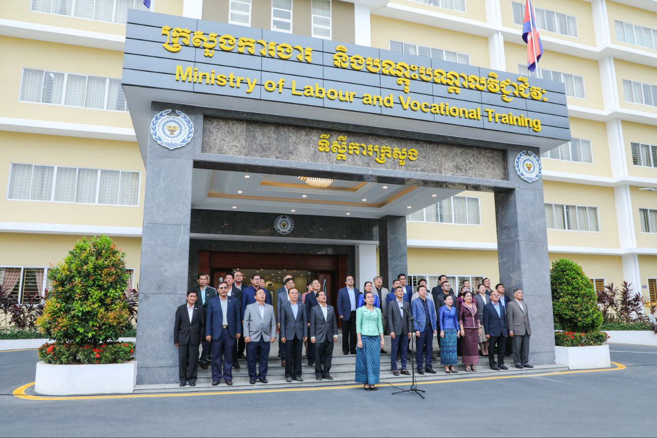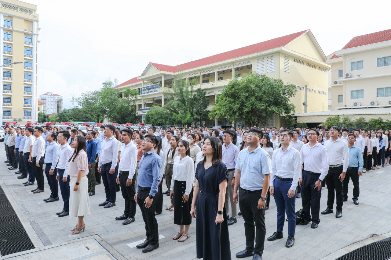 នាល្ងាចថ្ងៃសុក្រទី២ ខែសីហា ឆ្នាំ២០២៤នេះ ថ្នាក់ដឹកនាំ និងមន្ត្រីរាជការនៃក្រសួងការងារ និងបណ្តុះបណ្តាលវិជ្ជាជីវៈ បានចូលរួមគោរពទង់ជាតិនៃព្រះរាជាណាចក្រកម្ពុជា ដោយច្រៀងចម្រៀងបទ «នគររាជ» និងច្រៀងបទ «ពង្សាវតារខ្មែរ» ដោយផ្ទាល់រួមគ្នា។