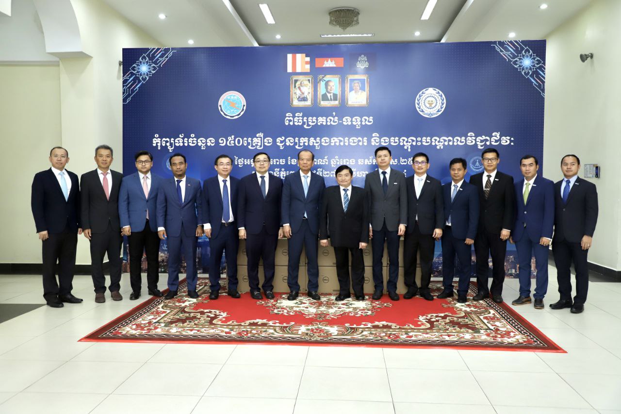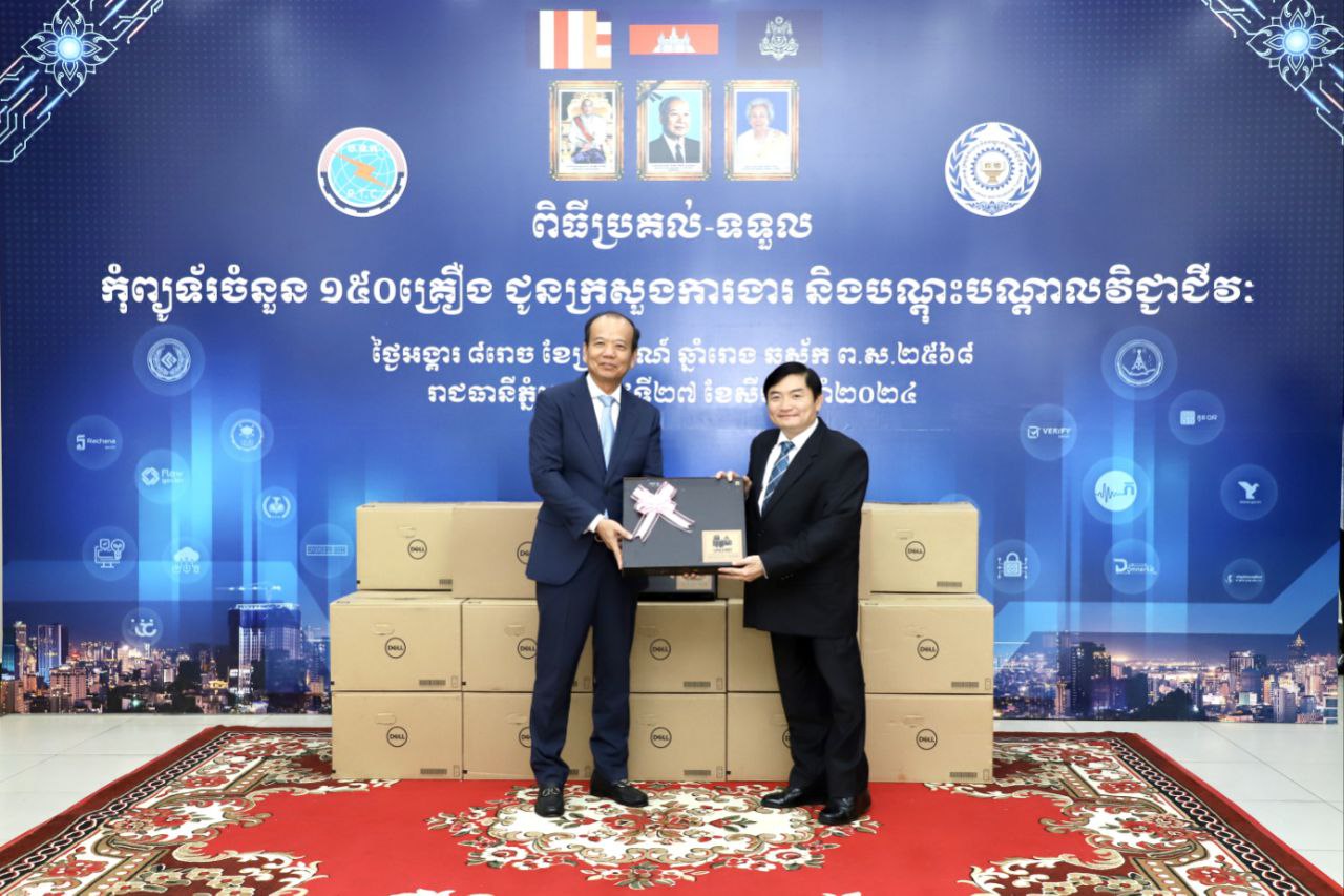 (ភ្នំពេញ)៖ នាទីស្តីការក្រសួងប្រៃសណីយ៍ និងទូរគមនាគមន៍ ឯកឧត្តម ហេង សួរ រដ្ឋមន្ត្រីក្រសួងការងារ និងបណ្តុះបណ្តាលវិជ្ជាជីវៈ នៅរសៀលថ្ងៃទី២៧ ខែសីហា ឆ្នាំ២០២៤នេះ បានទទួលកុំព្យូទ័រចំនួន១៥០គ្រឿងពីឯកឧត្តម ជា វ៉ាន់ដេត រដ្ឋមន្ត្រីក្រសួងប្រៃសណីយ៍ និងទូរគមនាគមន៍ ដែលជាផ្នែកមួយនៃកិច្ចសហប្រតិបត្តិការដាក់ឱ្យប្រើប្រាស់ថ្នាលផ្ទៀងផ្ទាត់ឯកសារ Verify.gov.kh និងជំរុញការធ្វើបរិវត្តកម្មឌីជីថល។
