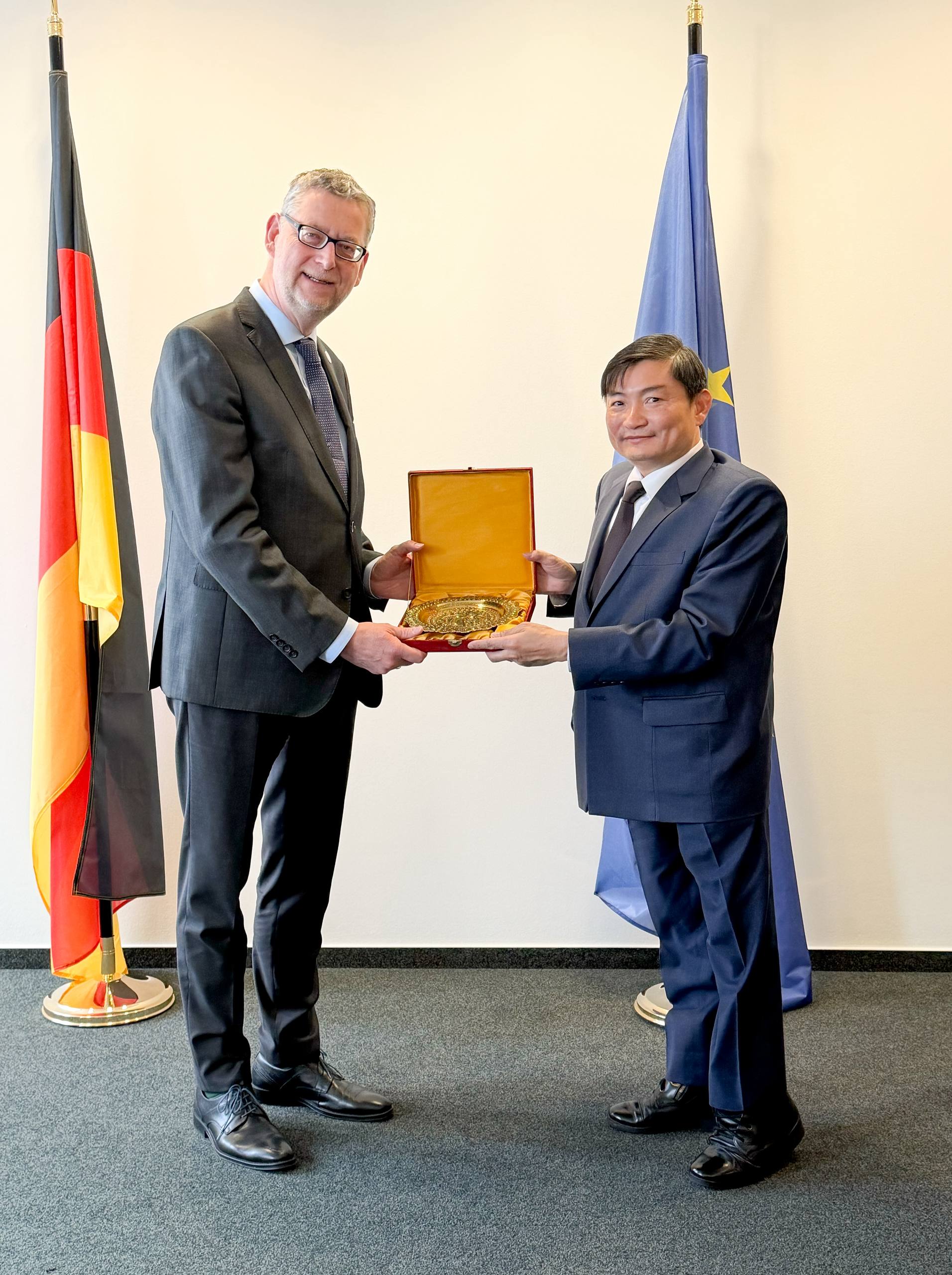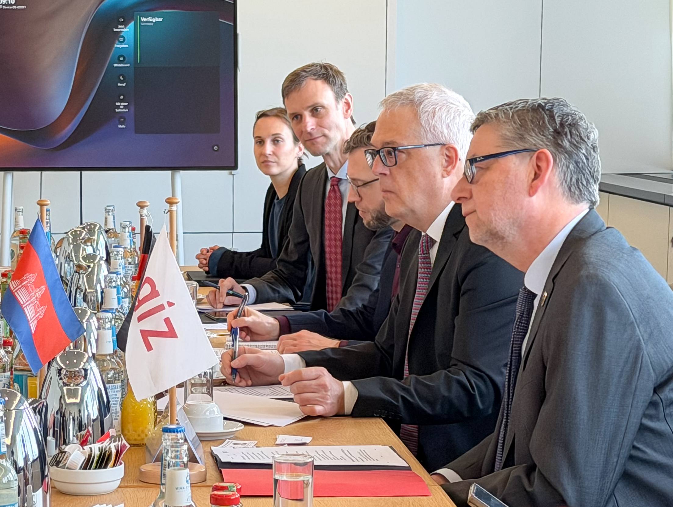 នៅក្នុងឱកាសនោះ ប្រតិភូបានជួបពិភាក្សាការងារជាមួយលោក ថស៍ស្ទីន ហ្សាវហ្វឺ ហ្គាមបល (Thorsten Schafer Gumbel) ប្រធានក្រុមប្រឹក្សាភិបាលនៃទីភ្នាក់ងារសហប្រតិបត្តិការអាល្លឺម៉ង់ (GIZ) ដែលនៅក្នុងជំនួបនោះភាគីទាំងពីរបានរំលឹកពីចំណងមិត្តភាពការទូតដ៏យូរលង់ និងកិច្ចសហប្រតិបត្តិការដ៏ល្អរវាងកម្ពុជា និងអាល្លឺម៉ង់។ ភាគីទាំងពីរក៏បានឯកភាពគ្នាក្នុងការបន្តពង្រឹងកិច្ចសហប្រតិបត្តិការលើវិស័យការងារ សន្តិសុខសង្គម និងបណ្តុះបណ្តាលវិជ្ជាជីវៈ ជាពិសេសលើការលើកកម្ពស់ការអភិវឌ្ឍជំនាញ ដែលជាកត្តាចាំបាច់សម្រាប់កម្ពុជាក្នុងការបន្តរក្សាបាននូវភាពប្រកួតប្រជែងនៅពេលកម្ពុជាបានចាកចេញពីប្រទេសអភិវឌ្ឍតិចតួច (LDC)។