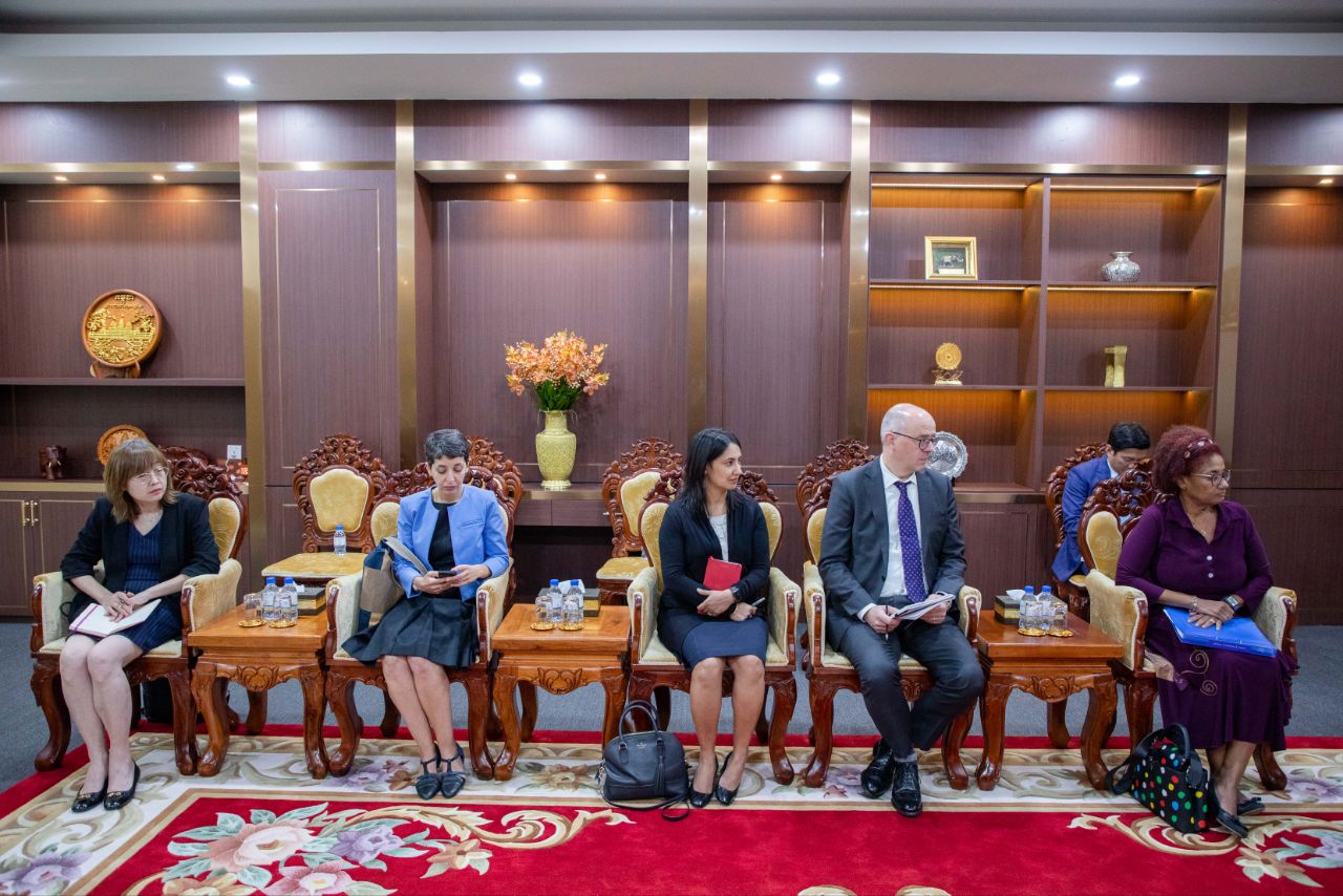 (ភ្នំពេញ)៖ ឯកឧត្តម ហេង សួរ រដ្ឋមន្ត្រីក្រសួងការងារ និងបណ្តុះបណ្តាលវិជ្ជាជីវៈ នៅរសៀលថ្ងៃពុធ ទី២៧ ខែកញ្ញា ឆ្នាំ២០២៣នេះ បានជួបពិភាក្សាការងារជាមួយលោកស្រី ម៉ារីយ៉ាម ស្ហឺរមែន(Mariam Sherman) នាយកធនាគារពិភពលោកប្រចាំប្រទេសមីយ៉ាន់ម៉ា កម្ពុជា និងសាធារណរដ្ឋប្រជាមានិតប្រជាធិបតេយ្យឡាវ នៅទីស្តីការក្រសួងការងារ និងបណ្តុះបណ្តាលវិជ្ជាជីវៈ។