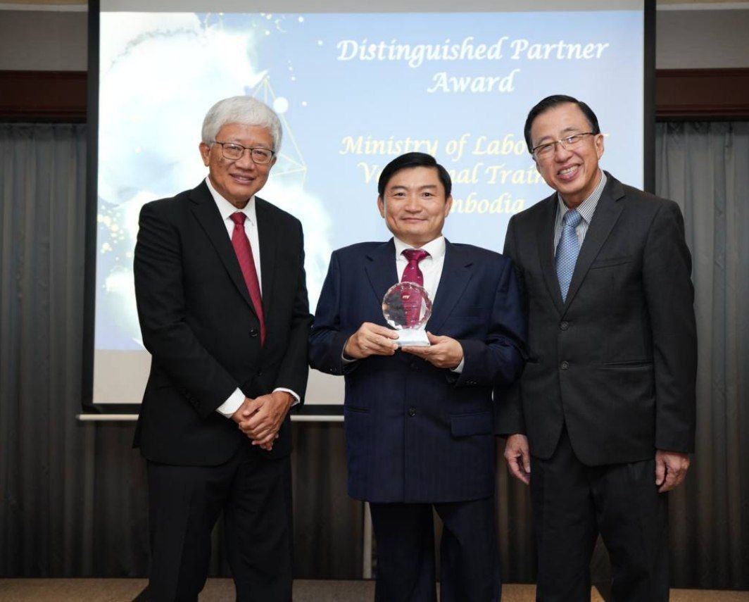 (សិង្ហបុរី)៖ តាមរយៈកិច្ចសហប្រតិបត្តិល្អក្នុងការកសាងសមត្ថភាពគ្រូបង្គោល និងអភិវឌ្ឍផ្នែកអប់រំបណ្ដុះបណ្ដាលបច្ចេកទេសនិងវិជ្ជាជីវៈ (TVET) ប្រកបដោយលទ្ធផលគាប់ប្រសើរនោះ វិទ្យាស្ថានអប់រំបណ្ដុះបណ្ដាលបច្ចេកទេស ហៅកាត់ ITE នៃប្រទេសសិង្ហបុរី បានប្រគល់ពានរង្វាន់ «កិច្ចសហប្រតិបត្តិល្អក្នុងការកសាងសមត្ថភាពគ្រូបង្គោល និងអភិវឌ្ឍផ្នែកអប់រំបណ្ដុះបណ្ដាលបច្ចេកទេសនិងវិជ្ជាជីវៈ (TVET)» ជូនដល់ក្រសួងការងារ និងបណ្ដុះបណ្ដាលវិជ្ជាជីវៈកម្ពុជា។