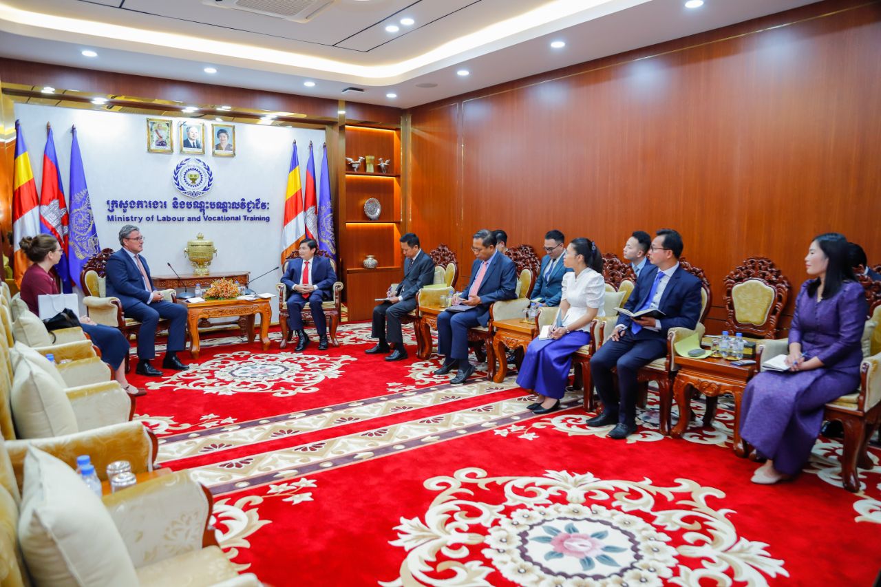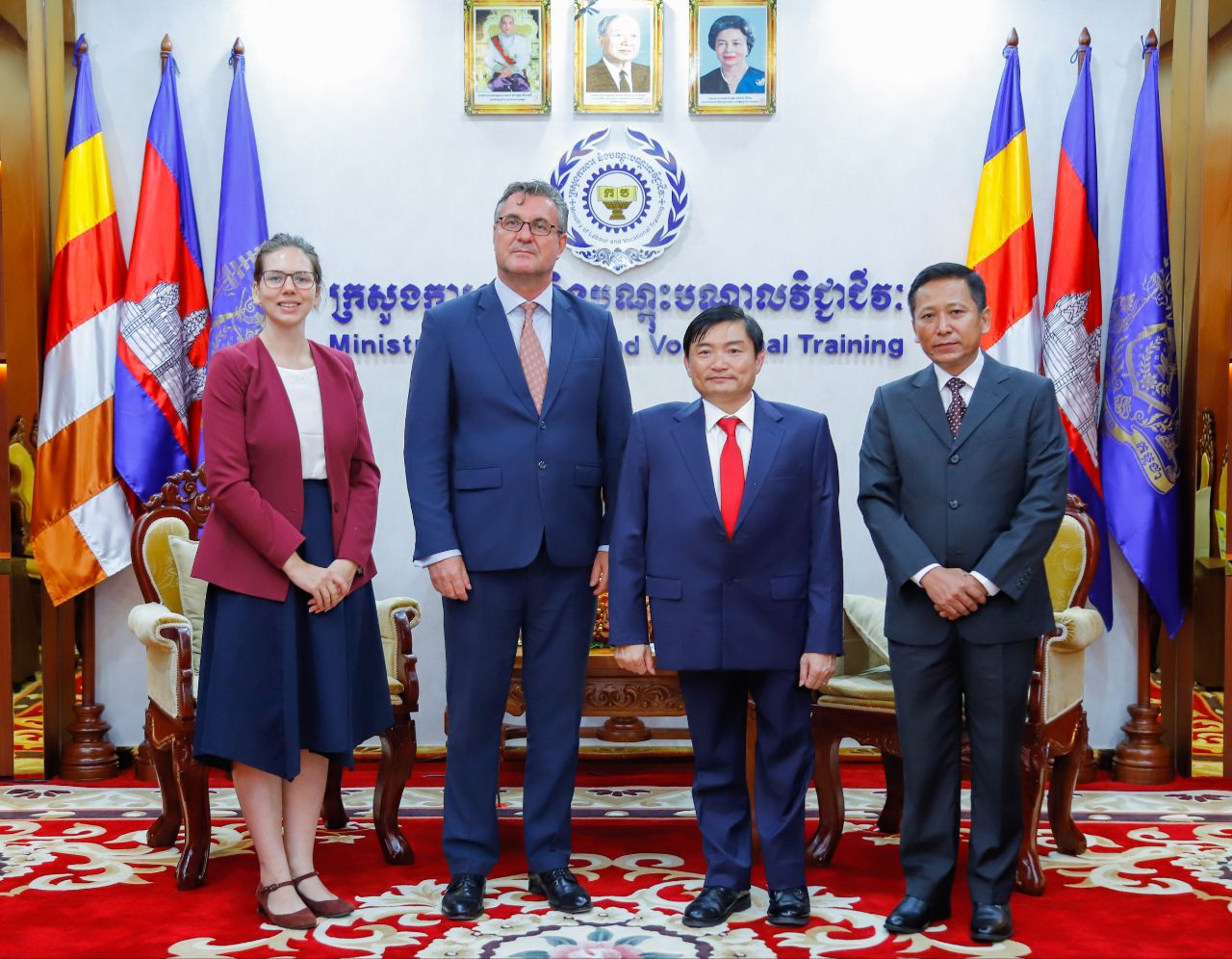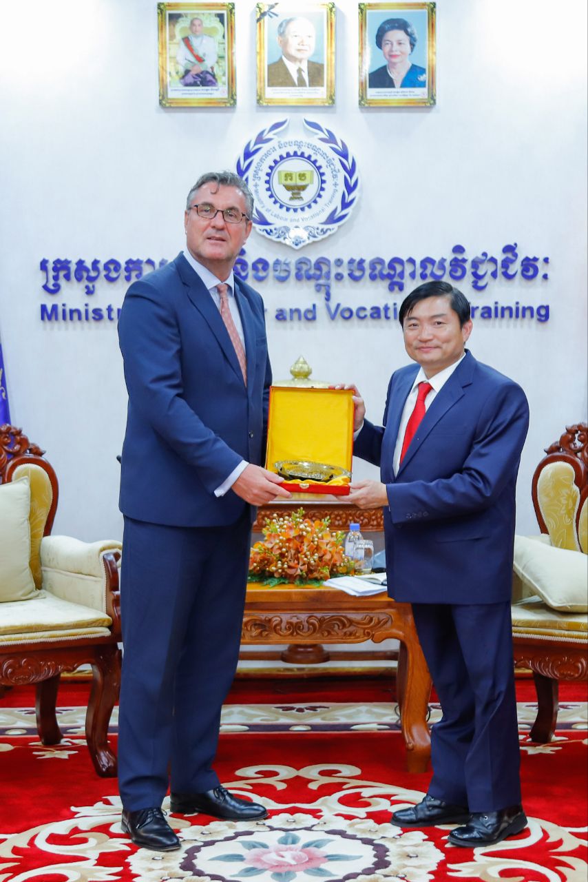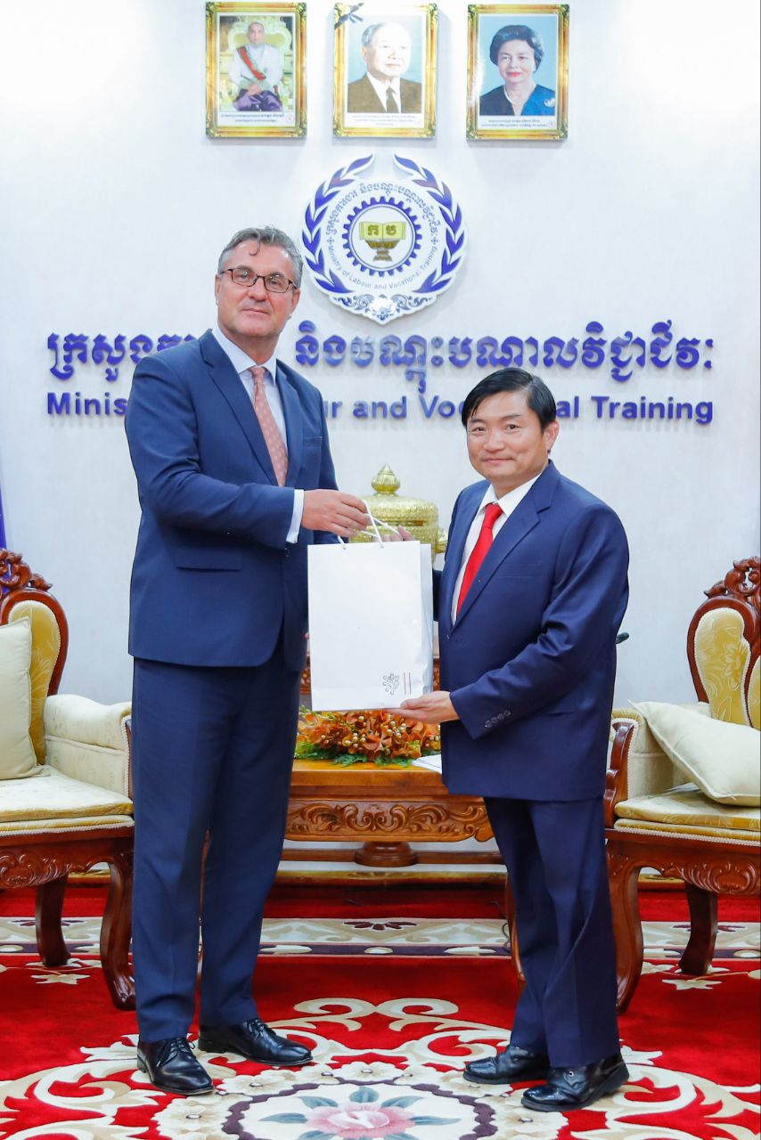 (ភ្នំពេញ)៖ នៅក្នុងជំនួបសម្តែងការគួរសម និងពិភាក្សាការងារ ជាមួយឯកឧត្តម ហេង សួរ រដ្ឋមន្ត្រីក្រសួងការងារ និងបណ្តុះបណ្តាលវិជ្ជាជីវៈ នៅទីស្តីការក្រសួង នារសៀលថ្ងៃទី២២ ខែវិច្ឆិកា ឆ្នាំ២០២៣នេះ ឯកឧត្តម Martin Vávra ឯកអគ្គរដ្ឋទូតនៃសាធារណរដ្ឋឆែកប្រចាំព្រះរាជាណាចក្រកម្ពុជា បានសម្តែងការគាំទ្រចំពោះការចាប់ផ្តើមអនុវត្តកម្មវិធីថ្នាក់ជាតិចំនួន២របស់រាជរដ្ឋាភិបាលកម្ពុជា ដែលរួមមាន “កម្មវិធីបណ្តុះបណ្តាលជំនាញវិជ្ជាជីវៈ និងបច្ចេកទេស ជូនដល់គ្រួសារក្រីក្រ និងងាយរងហានិភ័យ ចំនួន ១,៥លាននាក់” និង “កម្មវិធីរបបសន្តិសុខសង្គម ផ្នែកថែទាំសុខភាពតាមរបបភាគទានដោយស្ម័គ្រចិត្ត សម្រាប់បុគ្គលស្វ័យនិយោជន៍ និងអ្នកនៅក្នុងបន្ទុកសមាជិក ប.ស.ស.”។