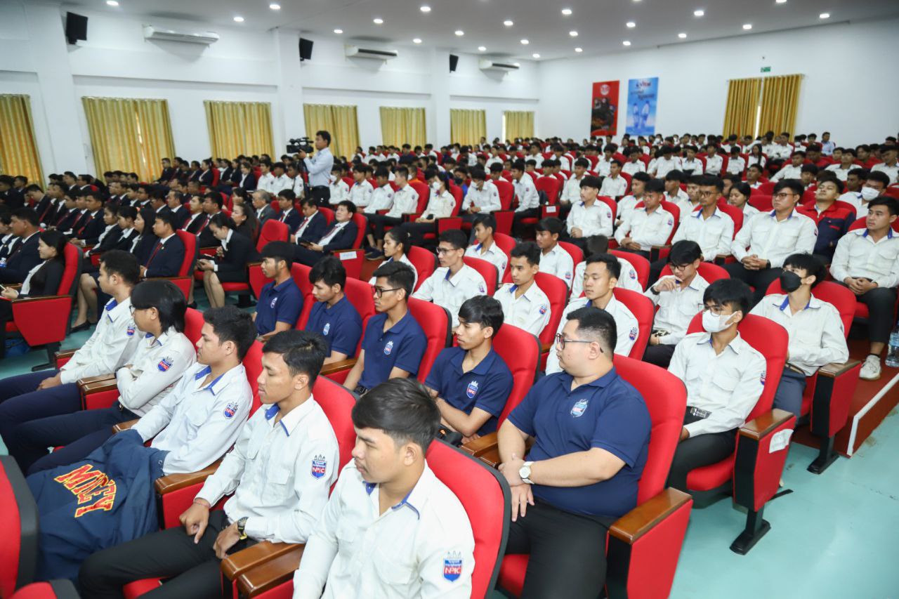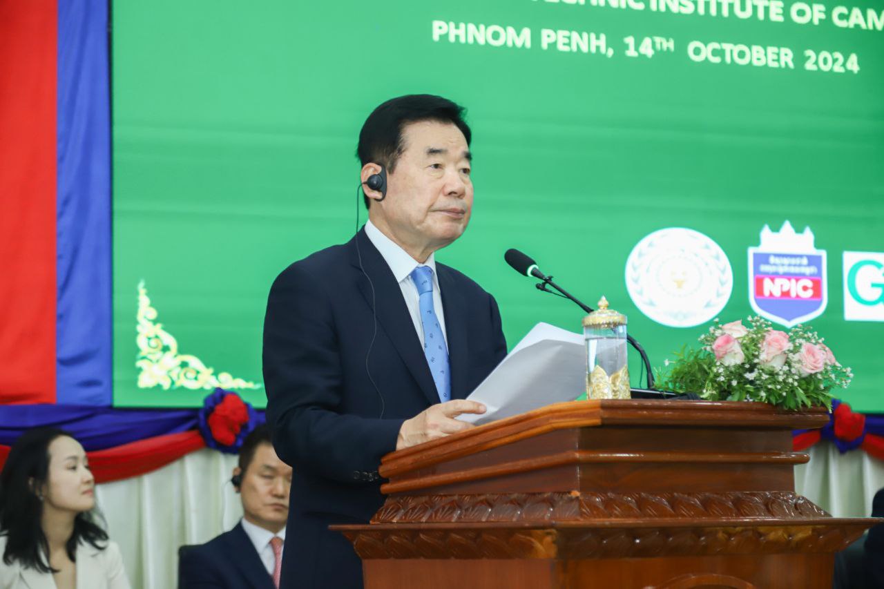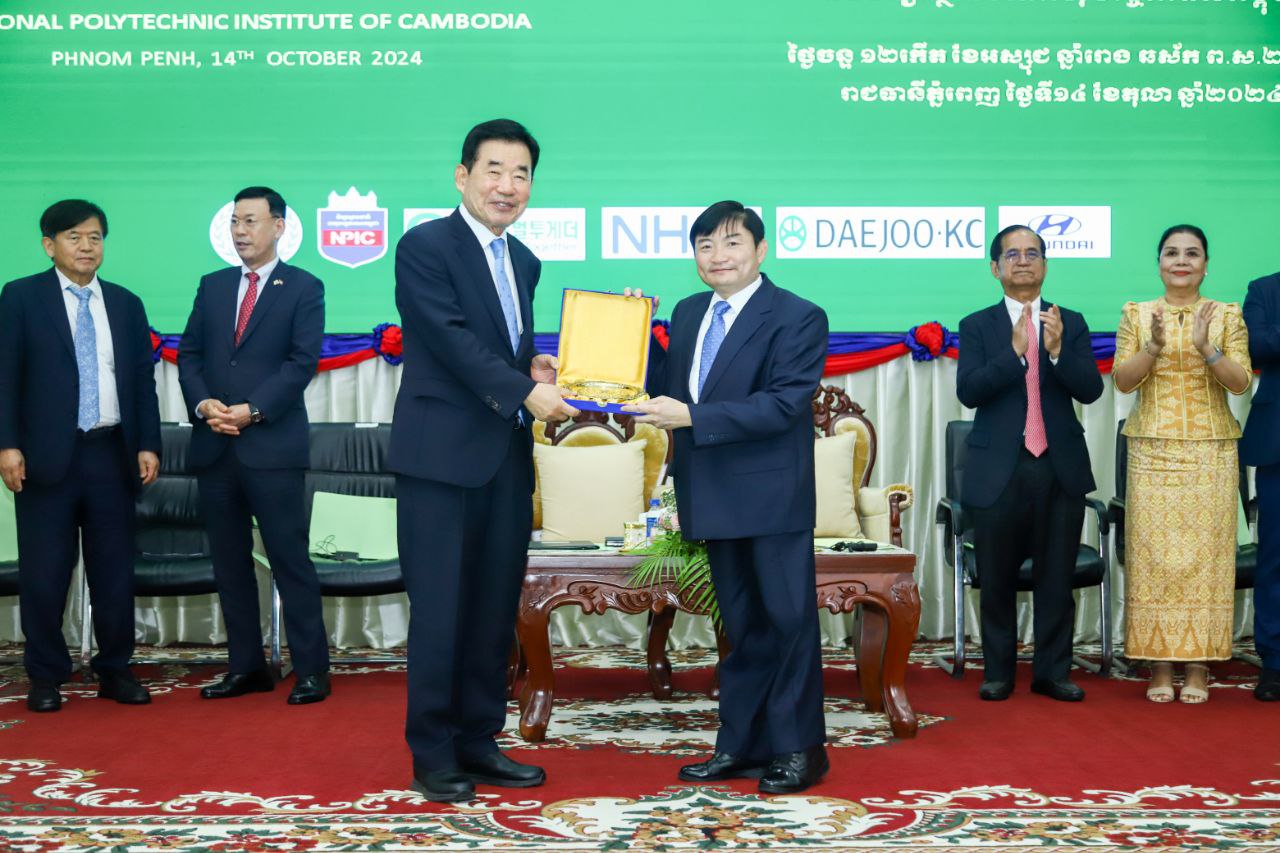 (ភ្នំពេញ)៖ ឯកឧត្តម ហេង សួរ រដ្ឋមន្ត្រីក្រសួងការងារ និងបណ្តុះបណ្តាលវិជ្ជាជីវៈ និងឯកឧត្តម KIM Jin-Pyo (គីម ជីនផ្យូ) ប្រធានស្ថាប័នសិក្សាផ្នែកនវានុវត្តន៍សាកល និងជាអតីតប្រធានរដ្ឋសភាជាតិនៃសាធារណរដ្ឋកូរ៉េ បានអញ្ជើញជាអធិបតីក្នុងពិធីបើក «វគ្គបណ្តុះបណ្តាលវិជ្ជាជីវៈ និងបណ្តុះបណ្តាលមុនចុះកម្មសិក្សាដល់សិស្សនិស្សិតនៃវិទ្យាស្ថានជាតិពហុបច្ចេកទេសកម្ពុជា» ក្រោមកិច្ចសហការដោយ គ្លូប៊លធូហ្គេតដឺ ណុងហឹប ថេជូខេស៊ី ក្រុមហ៊ុនហ៊ីយុនដាយខេមកូម៉ូធ័រ និងវិទ្យាស្ថានជាតិពហុបច្ចេកទេសកម្ពុជា នាព្រឹកថ្ងៃទី១៤ ខែតុលា ឆ្នាំ២០២៤ នៅសាលមហោស្រពនៃវិទ្យាស្ថានជាតិពហុបច្ចេកទេសកម្ពុជា(NPIC)។