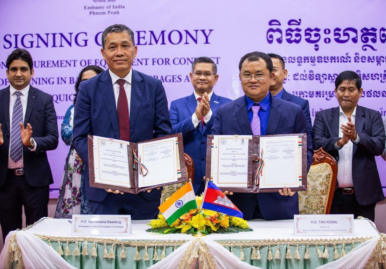 (ភ្នំពេញ)៖ នាព្រឹកថ្ងៃទី៣ ខែធ្នូ ឆ្នាំ២០២៥ ឯកឧត្តម ម៉ុល វិបុល អនុរដ្ឋលេខាធិការ ក្រសួងការងារ និងបណ្ដុះបណ្ដាលវិជ្ជាជីវ: តំណាងដ៏ខ្ពង់ខ្ពស់ឯកឧត្តមរដ្ឋមន្រ្តី ហេង សួរ បានអញ្ជើញចូលរួមជាសក្ខីភាពក្នុងពិធីចុះអនុស្សរណៈនៃការយោគយល់គ្នារវាងស្ថានទូតឥណ្ឌា និងវិទ្យាស្ថានជាតិសហគ្រិនភាព និងនវានុវត្តន៍ (NIEI)។