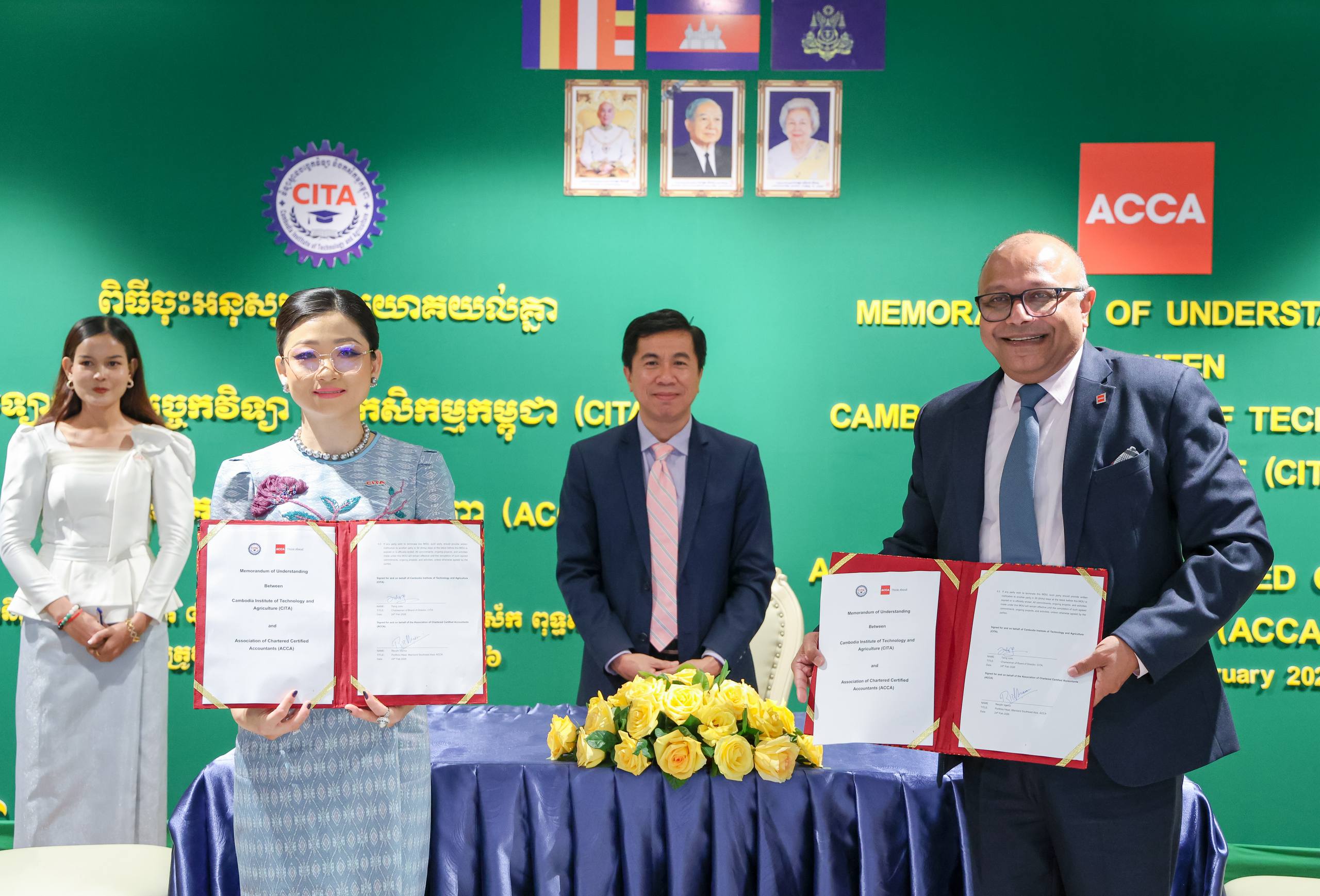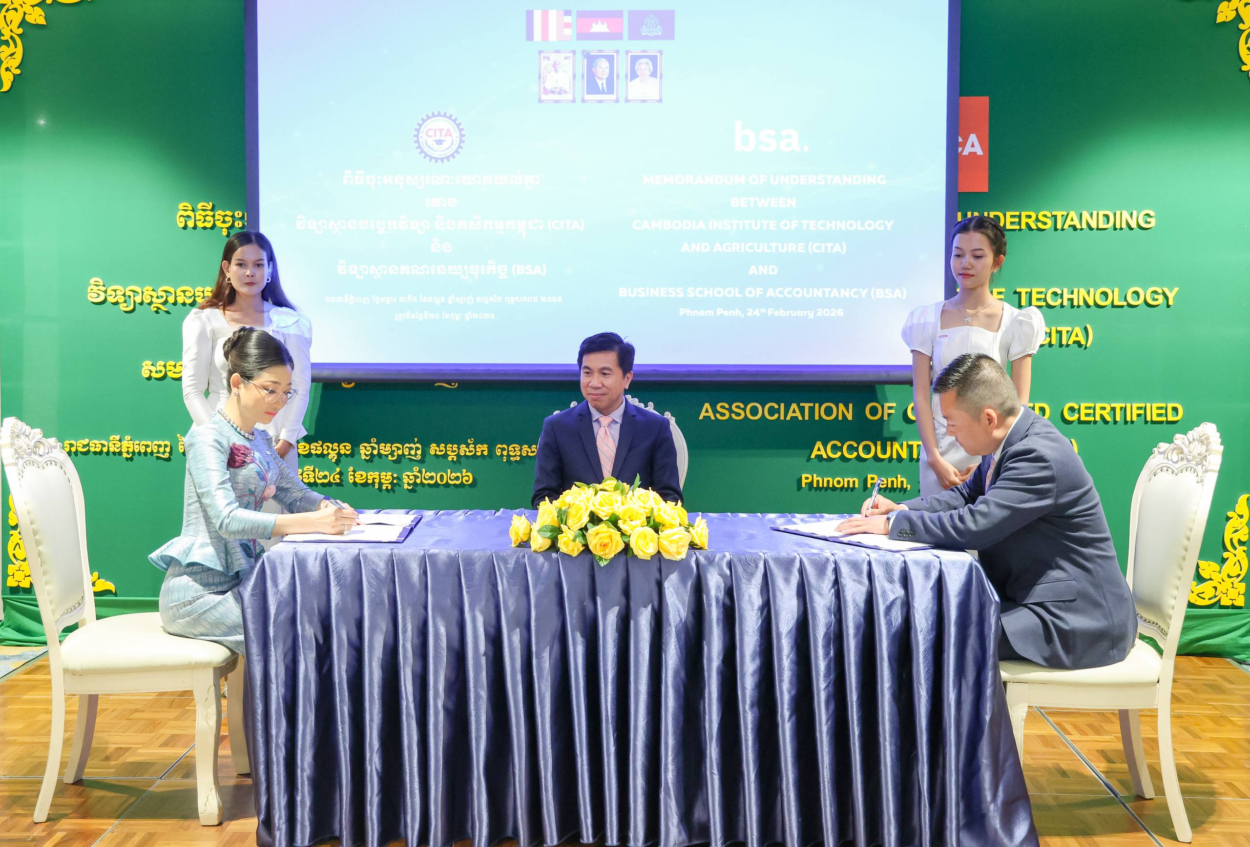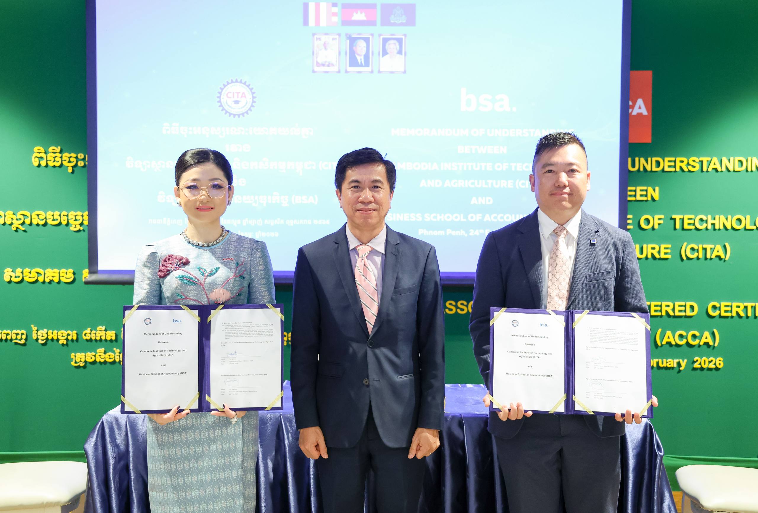 (ភ្នំពេញ)៖ នៅរសៀលថ្ងៃអង្គារ ទី២៤ ខែកុម្ភៈ ឆ្នាំ២០២៦ វិទ្យាស្ថានបច្ចេកវិទ្យា និងកសិកម្មកម្ពុជា (CITA) បានចុះអនុស្សរណៈនៃការយោគយល់គ្នា (MoU) ជាមួយសមាគមគណនេយ្យករជំនាញ (ACCA) និងវិទ្យាស្ថានគណនេយ្យធុរកិច្ច (BSA) ដែលពិធីនេះប្រព្រឹត្តទៅក្រោមអធិបតី ឯកឧត្តម ជា កុសល រដ្ឋលេខាធិការ តំណាងដ៏ខ្ពង់ខ្ពស់របស់ ឯកឧត្តម ហេង សួរ រដ្ឋមន្ត្រីក្រសួងការងារ និងបណ្តុះបណ្តាលវិជ្ជាជីវៈ នៅសណ្ឋាគារ ហៃយ៉ាត់ រេជិនស៊ី រាជធានីភ្នំពេញ។