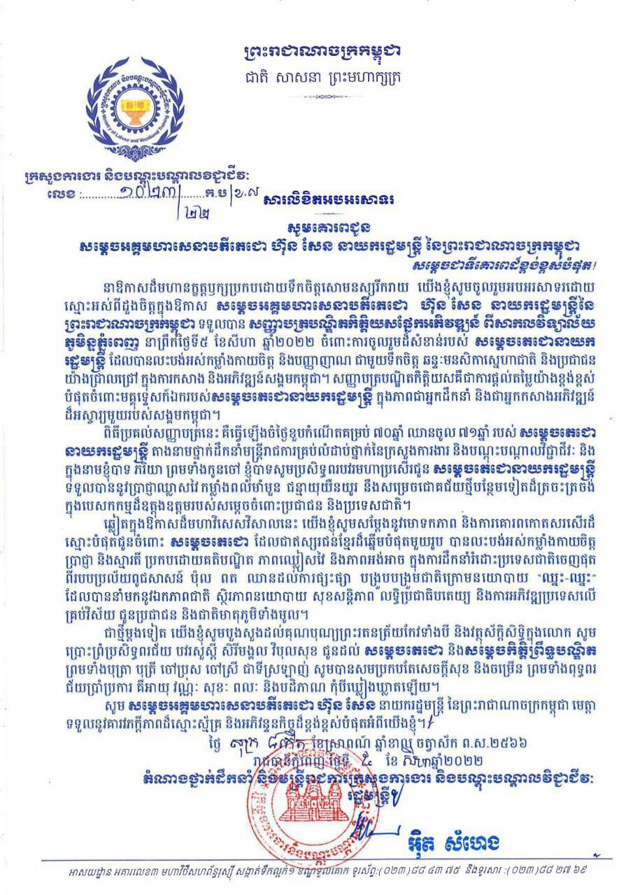សារលិខិតអបអរសាទរ សម្ដេចអគ្គមហាសេនាធិបតីតេជោ ហ៊ុន សែន នាយករដ្ឋមន្ត្រីនៃព្រះរាជាណាចក្រកម្ពុជា
