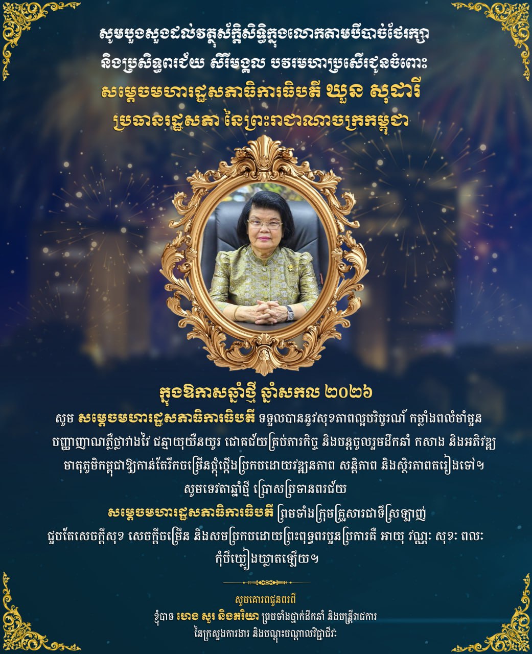 សារលិខិតជូនពរ សម្តេចមហារដ្ឋសភាធិការធិបតី ឃួន សុដារី ប្រធានរដ្ឋសភា នៃព្រះរាជាណាចក្រកម្ពុជា ព្រមទាំងក្រុមគ្រួសារជាទីស្រឡាញ់ នៅក្នុងឱកាសចូលឆ្នាំថ្មី ឆ្នាំសកល ២០២៦