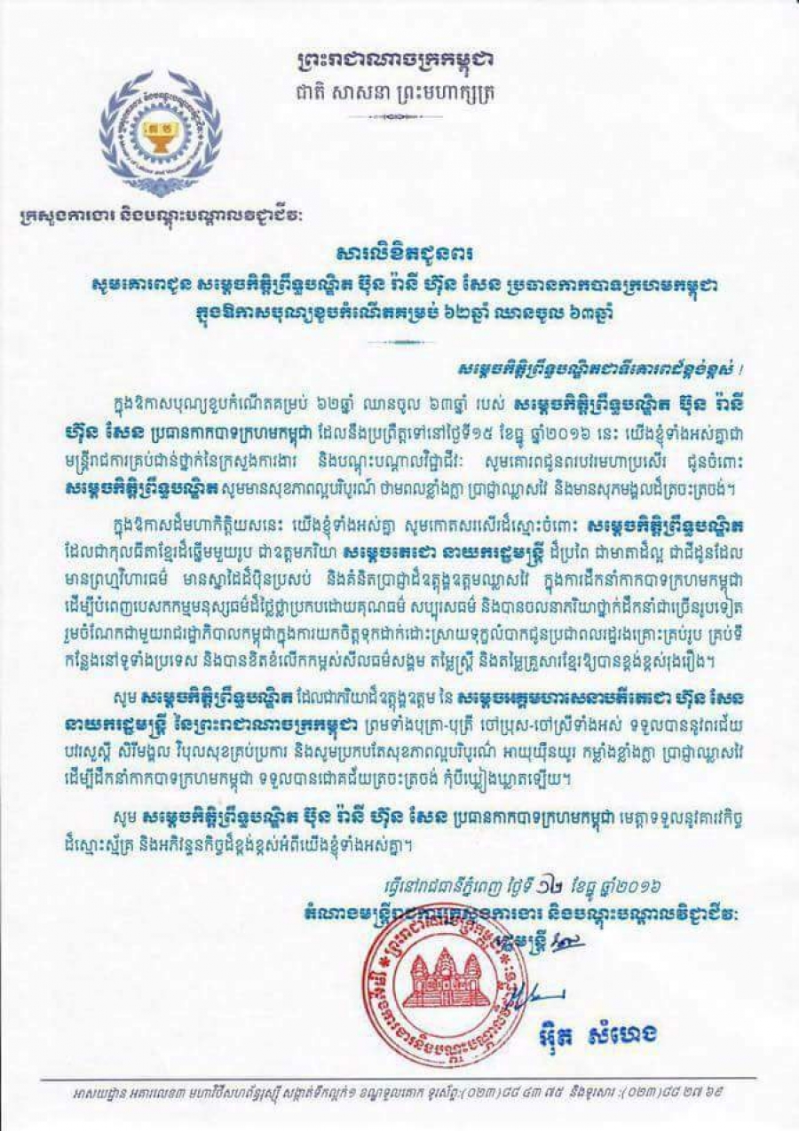 សារលិខិតជូនពរ សម្ដេចកិត្តិព្រឹទ្ធបណ្ឌិត ប៊ុន រ៉ានី ហ៊ុន សែន ប្រធានកាកបាទក្រហមកម្ពុជា ក្នុងឱកាសបុណ្យខួបកំណើតគម្រប់ ៦២ឆ្នាំ ឈានចូល ៦៣ឆ្នាំ