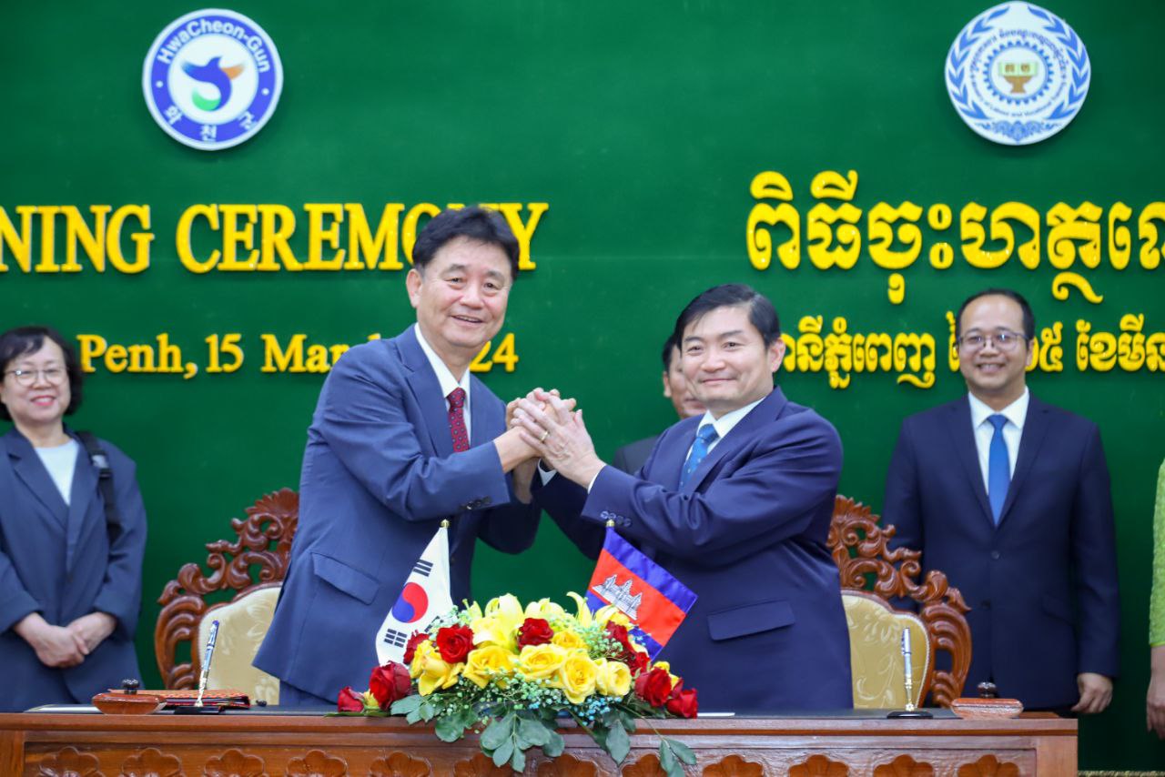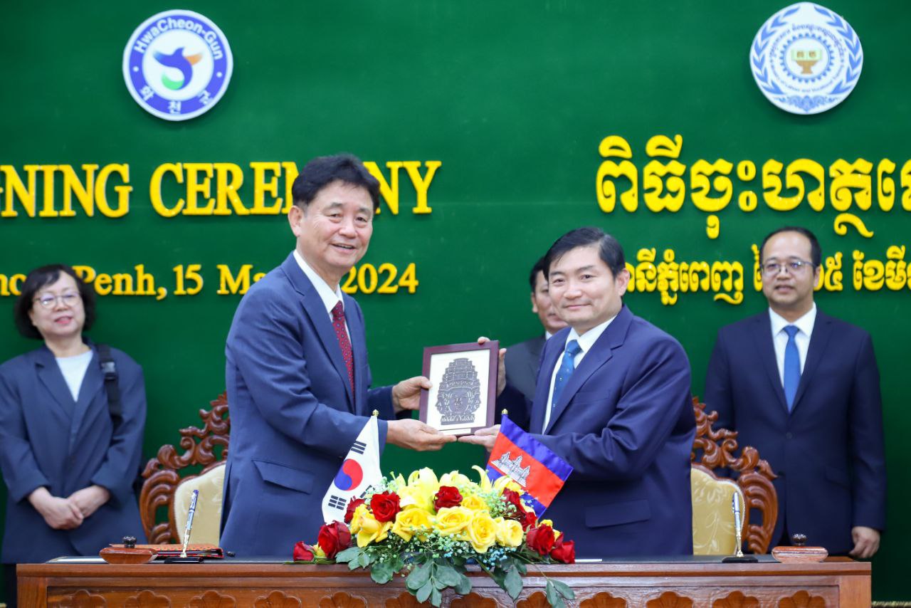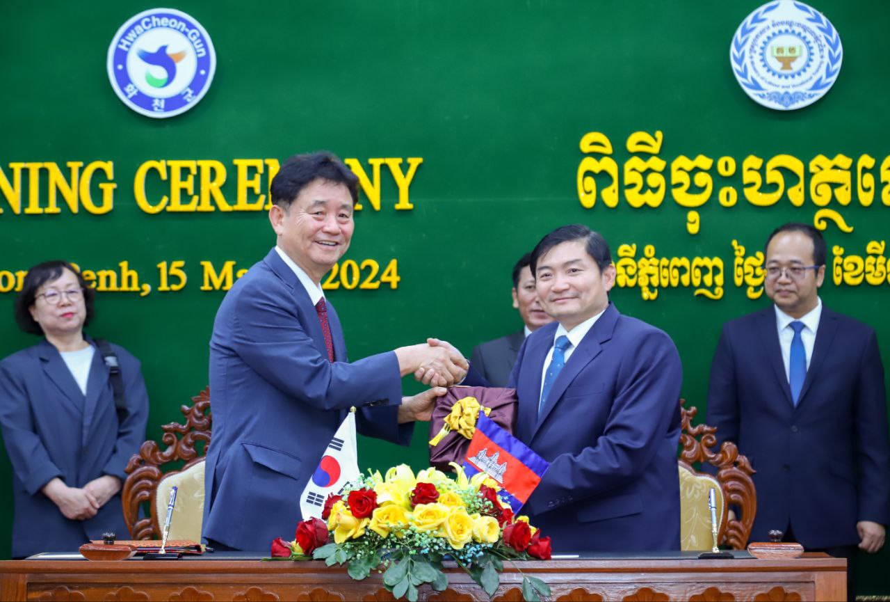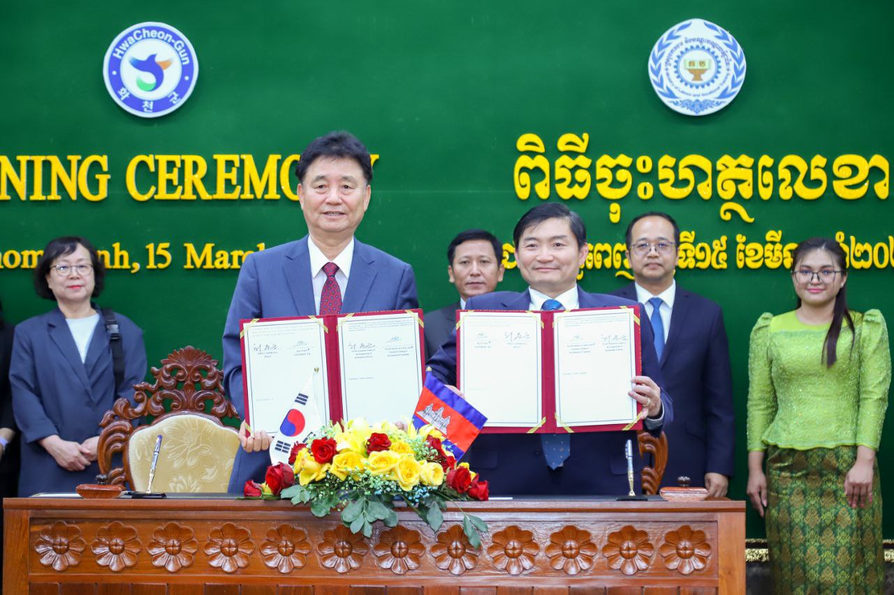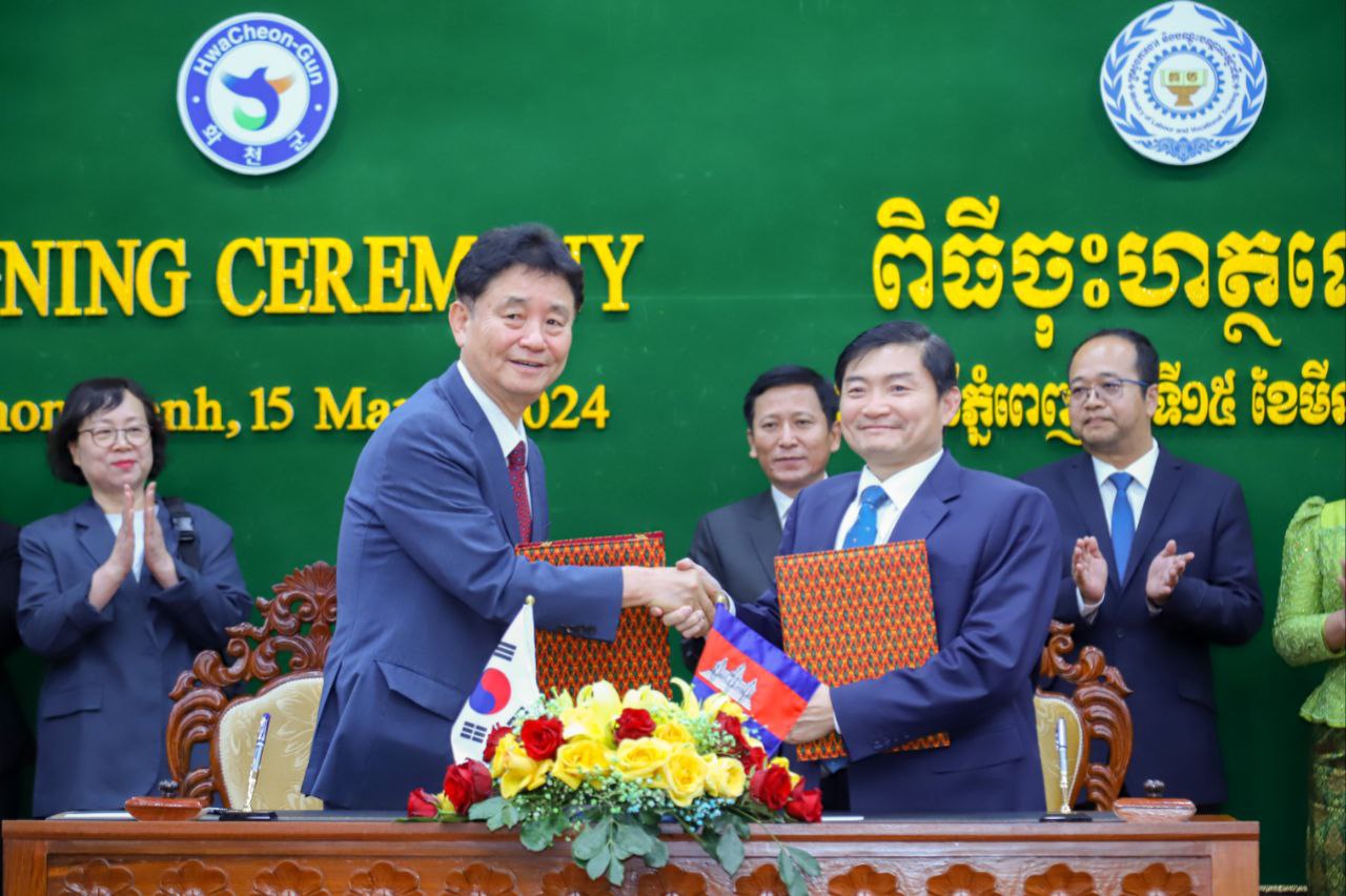 (ភ្នំពេញ)៖ ឯកឧត្តម ហេង សួរ រដ្ឋមន្ត្រីក្រសួងការងារ និងបណ្តុះបណ្តាលវិជ្ជាជីវៈ នៅរសៀលថ្ងៃទី១៥ ខែមីនា ឆ្នាំ២០២៤នេះ បានចុះហត្ថលេខាលើអនុស្សរណៈយោគយល់គ្នាជាមួយលោក ឆ្វេ មូនស៊ូន (Choi Moon Soon) អភិបាលស្រុកហ្វាឆន់ ខេត្តកាំងវ៉ុនដូនៃសាធារណរដ្ឋកូរ៉េ ដើម្បីផ្តល់ឱកាសដល់ពលរដ្ឋកម្ពុជាដែលមានបំណងទៅធ្វើការនៅសាធារណរដ្ឋកូរ៉េ។ ពិធីចុះហេត្ថលេខានេះ បានធ្វើឡើងនៅទីស្តីការក្រសួងការងារ និងបណ្តុះបណ្តាលវិជ្ជាជីវៈ។