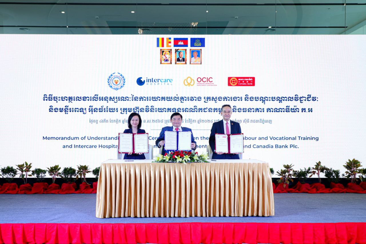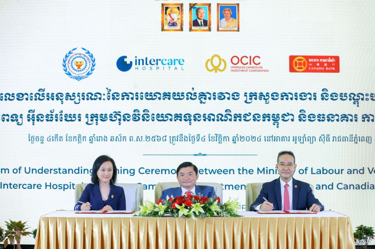 (ភ្នំពេញ)៖ ឯកឧត្តម ហេង សួរ រដ្ឋមន្ត្រីក្រសួងការងារ និងបណ្តុះបណ្តាលវិជ្ជាជីវៈ បានអញ្ជើញចុះហត្ថលេខាលើអនុស្សរណៈនៃការយោគយល់គ្នាចំនួន ៣ ជាមួយមន្ទីរពេទ្យ អ៉ីនធ័រឃែរ (Intercare Hospital) ក្រុមហ៊ុនសាជីវកម្មវិនិយោគក្រៅប្រទេសកម្ពុជា (OCIC) និងធនាគារកាណាឌីយ៉ា ដែលតំណាងដោយ លោកស្រីវេជ្ជបណ្ឌិត លឹម លីណា អនុប្រធានក្រុមប្រឹក្សាភិបាលនៃក្រុមហ៊ុន OCIC និងលោកឧកញ៉ា ឆារស៍ វ៉ាន់ អភិបាលនៃកាណាឌីយ៉ាគ្រុប។