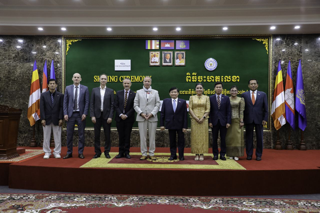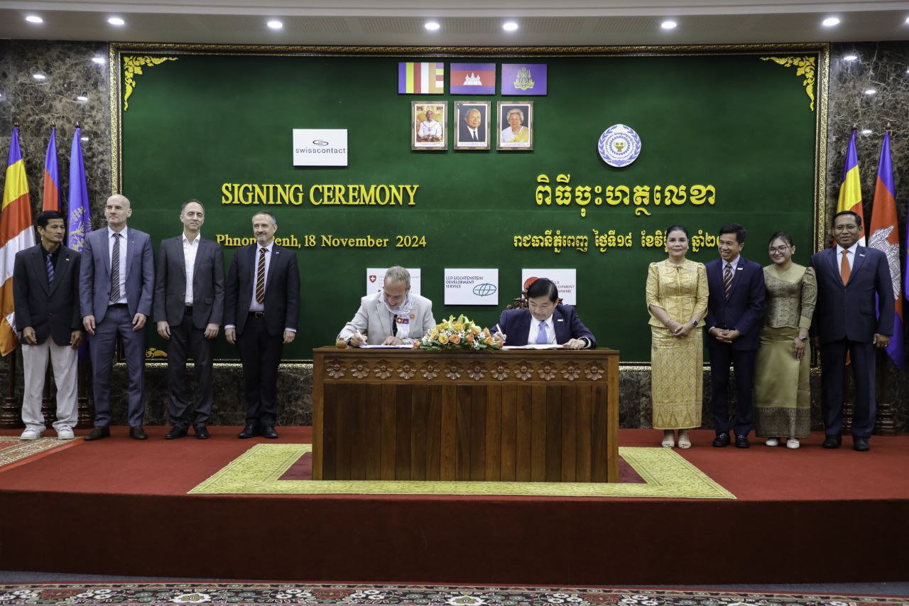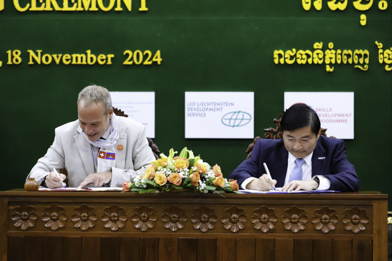 (ភ្នំពេញ)៖ នាព្រឹកថ្ងៃទី១៨ ខែវិច្ឆិកា ឆ្នាំ២០២៤ ឯកឧត្តម ហេង សួរ រដ្ឋមន្ត្រីក្រសួងការងារ និងបណ្តុះបណ្តាលវិជ្ជាជីវៈ និងលោក គ្រីស្ទៀន វ៉ុលឃឺ អាយឌី (Christian Volker Ide) ប្រធានក្រុមកម្មវិធីអភិវឌ្ឍន៍ជំនាញ (Skills Development Programme) បានអញ្ជើញចុះហត្ថលេខាលើអនុស្សរណៈនៃការយោគយល់គ្នា ស្តីពី «ការអនុវត្តកម្មវិធីអភិវឌ្ឍន៍ជំនាញ ដំណាក់កាលទី៣» ឆ្នាំ២០២៤-២០២៨ រវាងក្រសួងការងារ និងបណ្តុះបណ្តាលវិជ្ជាជីវៈ និងអង្គការ Swisscontact។