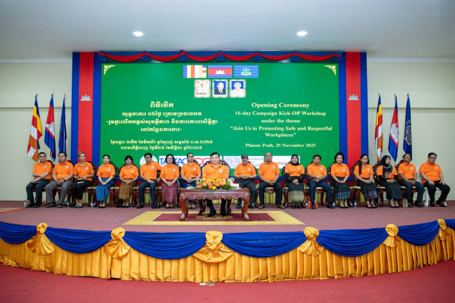 (ភ្នំពេញ)៖ ឯកឧត្តម ហេង សួរ រដ្ឋមន្រ្តីក្រសួងការងារ និងបណ្ដុះបណ្ដាលវិជ្ជាជីវៈ បានអញ្ជើញជាអធិបតីក្នុងពិធីបើកយុទ្ធនាការ ១៦ថ្ងៃ ក្រោមប្រធានបទ «រួមគ្នាលើកកម្ពស់សុវត្ថិភាព និងការគោរពសិទ្ធិគ្នានៅកន្លែងការងារ» ដើម្បីលើកកម្ពស់ការយល់ដឹង ពង្រឹងកិច្ចខិតខំប្រឹងប្រែងក្នុងការទប់ស្កាត់ និងជំរុញវិធានការ ដើម្បីឆ្លើយតបទៅនឹងអំពើហិង្សា និងការបៀតបៀននៅកន្លែងធ្វើការ ដោយរំលេចនូវការប្ដេជ្ញាចិត្តរបស់គ្រប់ភាគីពាក់ព័ន្ធ ក្នុងការបង្កើតវប្បធម៌សុវត្ថិភាព សេចក្ដីថ្លៃថ្នូរ និងការគោរពគ្នា ក្នុងវិស័យការងារនៅកម្ពុជា ជាពិសេសគឺវិស័យវាយនភណ្ឌ កាត់ដេរសម្លៀកបំពាក់ ស្បែកជើង និងផលិតផលធ្វើដំណើរ។